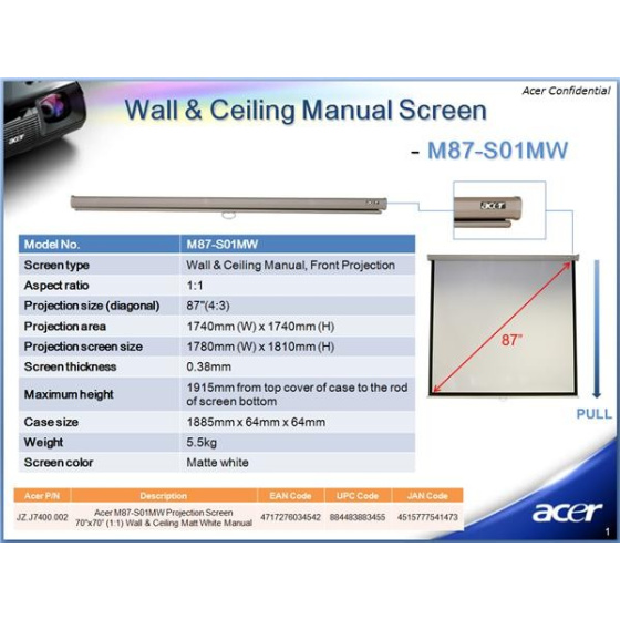 Akční nabídky na váš e-mailAcer M90-W01MG je nástěnné promítací plátno velikosti 90". Jedná se o plátno roletového typu, které se stahuje manuálním způsobem. Rozměry plochyčiní 1960 x 1100 mm při tloušťce 0,38 mm s poměrem stran 16:9.