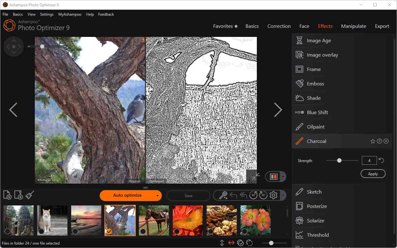 Uživatelské rozhraní programu Photo Optimizer je skutečně přehledné. Funkce jsou uspořádány do intuitivně pojmenovaných kategorií a nikdy nejsou vzdáleny více než dvě kliknutí. Tam, kde se v jiných editorech fotografií musíte probírat návody, vám Photo Optimizer poskytne výsledky okamžitě! Vše je jednoduché a logické, prakticky neexistuje žádná křivka učení. Ať už jste začátečník nebo pokročilý uživatel, nebo třeba jen nechcete trávit hodiny s úpravou obrázků, Ashampoo Photo Optimizer je program pro vás.