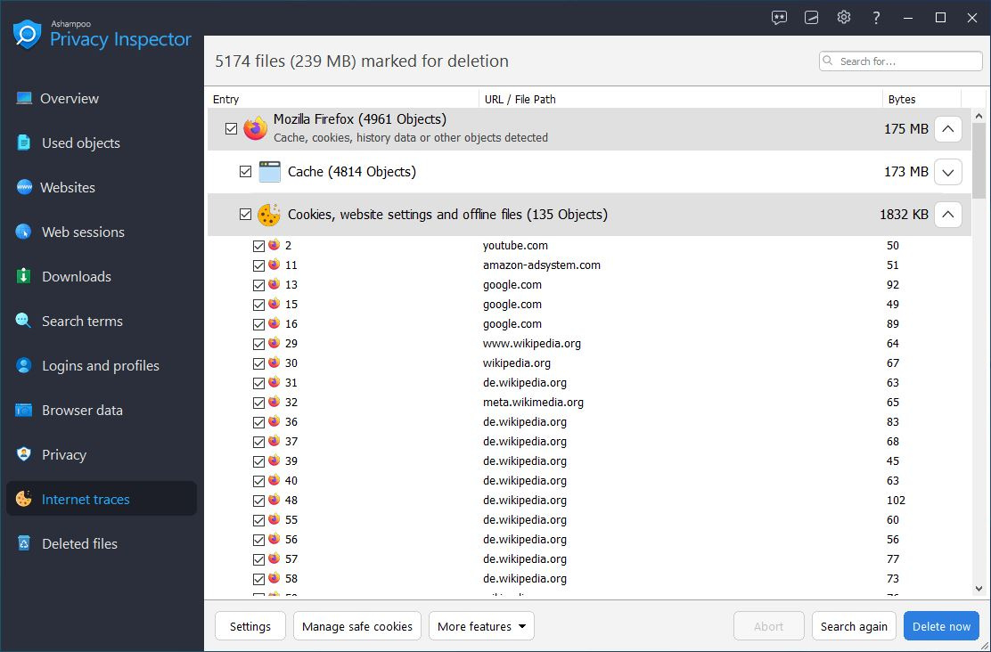 Někdy se stane, že si potřebujete zopakovat své poslední aktivity na internetu. Jak jste se dostali na danou stránku a co jste na ní hledali? Ashampoo Privacy Inspector vám pomůže analyzovat webové relace pomocí rozsáhlého seznamu nebo stromového zobrazení, které zahrnuje všechny vaše online aktivity. Oživte svou historii prohlížení webu a už nikdy neztraťte nit.