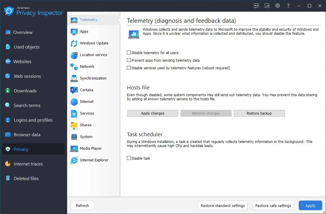 Ashampoo Privacy Inspector obsahuje vše, co potřebujete k omezení nadměrného shromažďování dat systémem Windows. Vypněte telemetrii a polohové služby, vypněte synchronizaci hesel a vypněte Cortanu. A v případě, že používáte tablet, abyste mohli se systémem Windows používat rukopis, možná vás bude zajímat, že systém Windows také odesílá vzorky vašeho rukopisu, takže nezapomeňte vypnout i tuto funkci! Zabere to jen několik kliknutí.