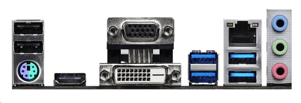 | Rear panel I/O | - 1 x PS/2 Mouse/Keyboard Port - 1 x D-Sub Port - 1 x DVI-D Port - 1 x HDMI Port - 2 x USB 2.0 Ports (Supports ESD Protection) - 4 x USB 3.2 Gen1 Ports (Supports ESD Protection) - 1 x RJ-45 LAN Port with LED (ACT/LINK LED and SPEED LED) - HD Audio Jacks: Line in / Front Speaker / Microphone |