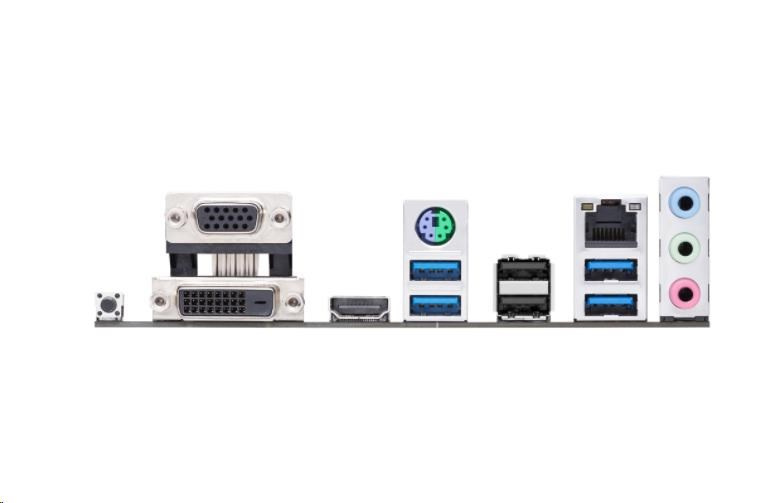 | Back I/O Ports | 1 x PS/2 keyboard/mouse combo port(s) 1 x DVI-D 1 x D-Sub 1 x HDMI 1 x LAN (RJ45) port(s) 4 x USB 3.2 Gen 1 (blue) Type-A 2 x USB 2.0 3 x Audio jack(s) 1 x BIOS FlashBack™ Button(s) |