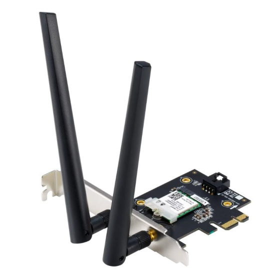 WiFi 6E PCI-E Adapter with 2 external antennas. Supporting 6GHz band, 160MHz, Bluetooth 5.2, WPA3 network security, OFDMA and MU-MIMO ASUS WiFi 6E total solution - optimized capabilities and performance All-new 6 GHz band - Less congestion and interference for WiFi connections Latest Bluetooth® 5.2 - improved signal range, faster transmit speeds and less interference Ultrafast WiFi 6 & WiFi 6E – 4.6X faster speeds, improved connection efficiency and better network security Reduced dead zones with external antennas - Adjustable antennas allows easy positioning for the best reception. Wi-Fi 6E (802.11ax) AXE5400 Tri-Band PCIe Wi-Fi Adapter MU-MIMO 160Mhz-Gigabit WiFi (2402Mbps) Bluetooth 5.2 Tri Band 2.4G & 5G & 6G.