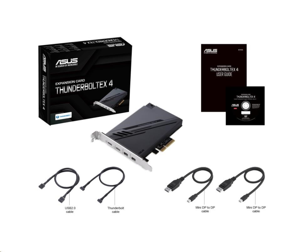 | Accessories | 2 x mini DisplayPort cables (links graphics output from motherboard’s or discrete graphics card’s DisplayPort to the mini DisplayPort IN port on the ThunderboltEX 4 card) 1 x USB 2.0 cable 1 x 14-1 pin Thunderbolt header cable 1 x User manual 1 x Support DVD with Thunderbolt™ driver |