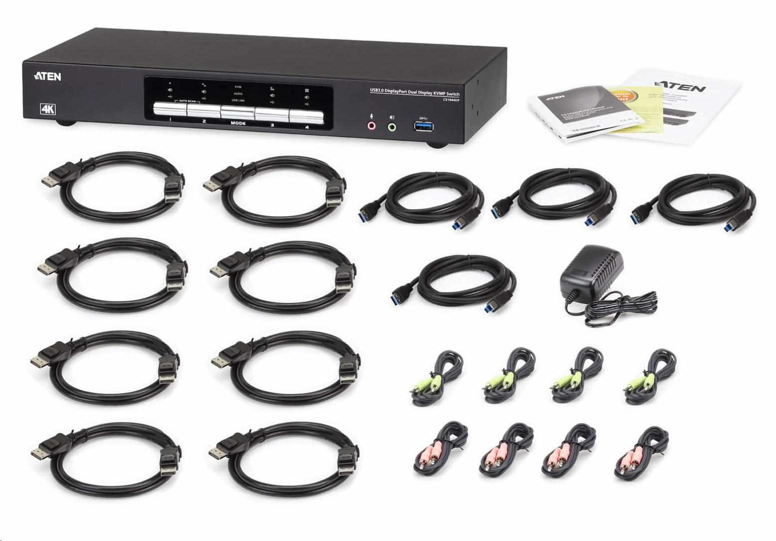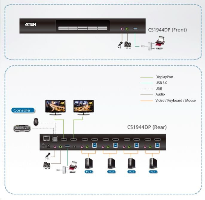 Přepínač KVM ATEN CS1944DP pomáhá organizovat pracovní plochu. Zvláště při správě multimediální pracovní stanice ve velké organizaci nabízí CS1944DP uživatelům okamžitý přístup ke čtyřem počítačům,