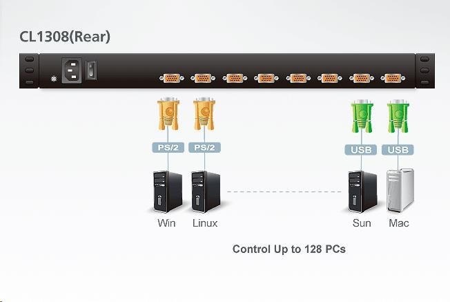 - možnost připojit počítače po USB i PS/2 (řeší se kabely)