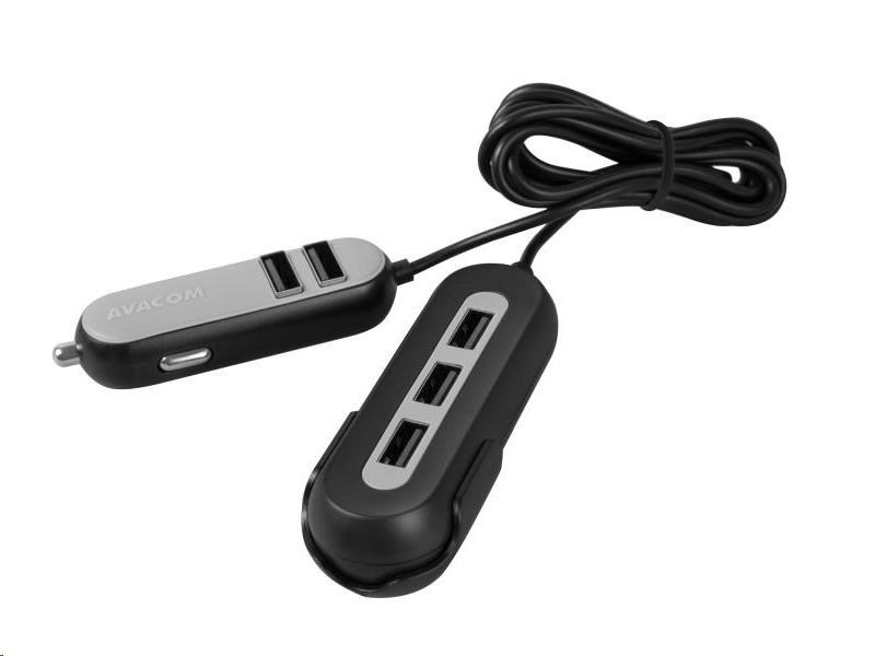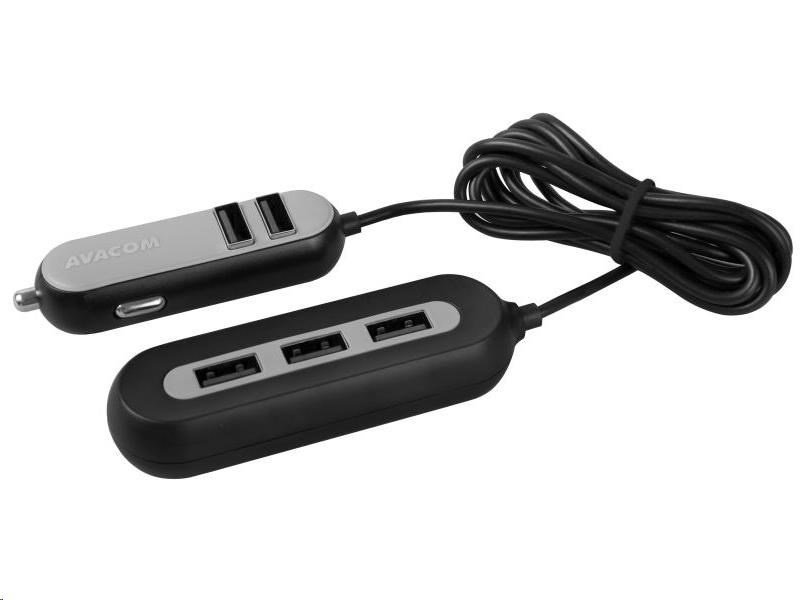 AVACOM CarHUB nabije 5 přístrojů současně. Má dvě části, které jsou spojené 1,5 m dlouhým kabelem. První část se dvěma USB výstupy lze zapojit do zásuvky autozapalovače. Další tři USB výstupy se dají pomocí praktického klipu připevnit za zadní sedadlo, což umožní nabíjení všem cestujícím v autě. Vysoký výstupní proud nabíječky (2,4 A na port a 10,8 A celkově) a výkon 54 W zaručují bezproblémové nabíjení náročných zařízení - smartphonů, tabletů nebo navigací.