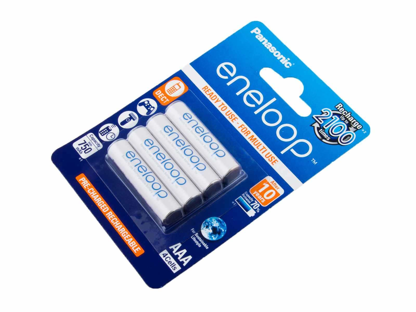 NiMH akumulátory PANASONIC - ENELOOP. Unikátní mikrotužkové baterie AAA (R03) nově s 2100 dobíjecími cykly, které mají maximálně eliminovaný efekt samovybíjení. Díky speciální technologii udrží tyto baterie po dobu deseti let 70% své kapacity. Baterie Eneloop se dodávají v nabitém stavu a jsou připraveny k okamžitému použití, což rozšiřuje možnosti jejich použití pro mnoho aplikací. Vhodné jsou zejména pro napájení fotoaparátů, bezšňůrových telefonů, walkmanů, diskmanů a všech zařízení, kde jsou používány alkalické primární baterie.