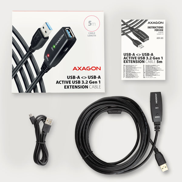 Akční nabídky na váš e-mailAktivní prodlužovací USB 3.2 Gen 1 kabel AXAGON ADR-305 délky 5 metrů je ideální k propojení Vašeho počítače s USB zařízením jako je myš, klávesnice, webkamera, tiskárna, skener, plotr a dalšími. Aktivní USB repeater kabel zesiluje průchozí signál a umožnuje připojit USB zařízení na výrazně větší vzdálenost, než Vám umožní pasivní kabel. Dosah kabelu je možné dále prodloužit použitím několika kabelů za sebou.