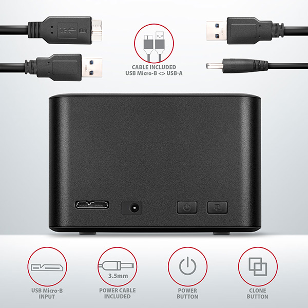 Dokovací stanici také využijete pro snadné klonování obsahu připojených disků bez potřeby připojení k PC. Do prvního slotu stanice HDD A (source) zasunete zdrojový disk a do druhého slotu HDD B (target) zasunete cílový. Pak jen zmáčknete klonovací tlačítko a sledujete průběh klonování na stupnici čtyř LED diod. Po zkopírování všech dat je na cílovém disku přesná kopie původního disku. Dock tak lze využít jako autonomní zařízení pro pohodlné duplikování a vytváření obrazů disků. Jedná se o nejjednodušší způsob, jak přenést obsah například starého HDD disku na nový SSD disk, a to včetně funkčního operačního systému (Windows, macOS, Linux …).