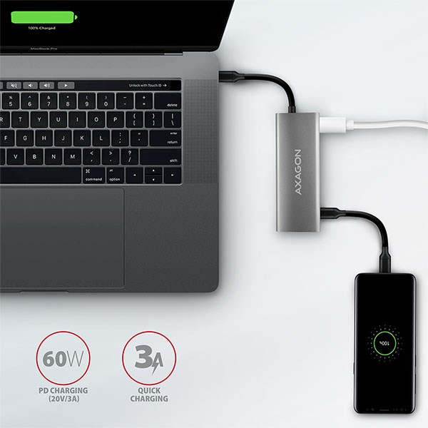 Jeden z USB-C portů je kombinovaný a může být použit buď pro přenos dat, nebo pro nabíjení telefonů a notebooků pomocí technologie Power Delivery 3.0 výkonem až 100W. Do hubu zapojíte vhodnou USB-C Power Delivery nabíječku a hub připojíte k notebooku s podporou Power Delivery. Tím také uvolníte jeden USB-C port.