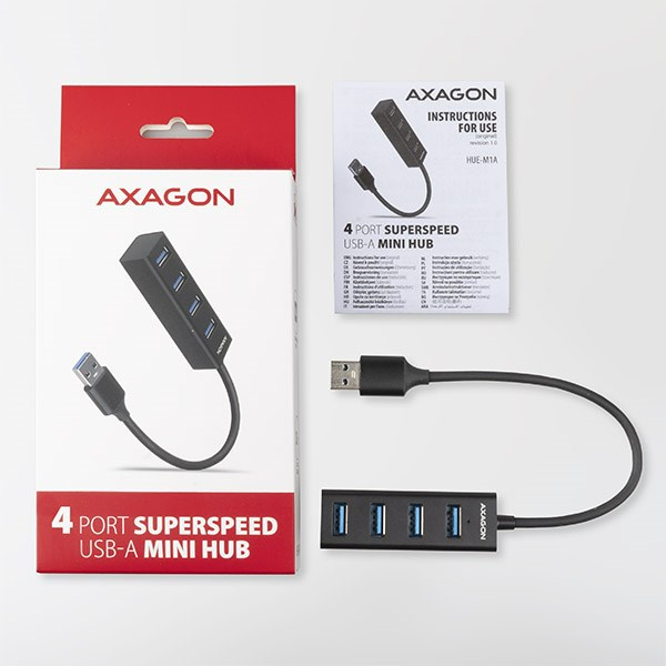 Akční nabídky na váš e-mailMiniaturní kovový USB 3.2 Gen 1 (USB 3.0) hub AXAGON HUE-M1A snadno a rychle připojí k notebooku nebo počítači až čtyři USB zařízení současně. Kovové tělo hubu je vyrobeno z hliníku a zajišťuje tak dokonalou mechanickou ochranu pro časté přenášení. Elegantní, jemně strukturovaný povrch brání nežádoucím otiskům. Gumové nožky zabraňují klouzání hubu po stole. Napevno uchycený USB kabel délky 20 cm je ideální pro uživatele mobilních zařízení.