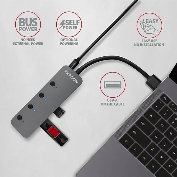 Všestrannost tohoto USB hubu zvyšuje také vestavěný micro USB konektor pro dodatečné napájení ze standardních USB nabíječek dodávaných k mobilním telefonům. Díky tomuto přídavnému napájení lze například připojit několik externích disků k počítači, notebooku, tabletu nebo smartphonu. Standard USB 3.2 Gen 1 umožní přenosovou rychlost až 5Gb/s.