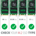 Adaptér podporuje použití SATA i NVMe (PCI-Express) M.2 SSD disků, jednostranných i oboustranných. Redukce nemá omezení kapacity SSD disků a lze použít M.2 karty všech rozměrů až do délky 110 mm. Samozřejmostí je fungování obou disků zároveň.