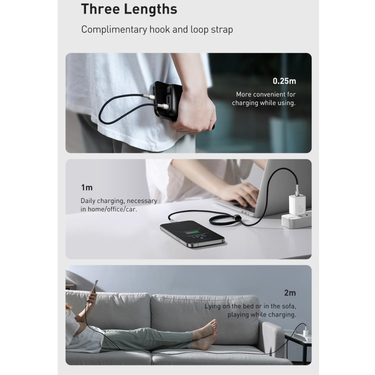 Kabel BASEUS Cafule Metal Series je odolný kabel, ve kterém jsou konce zástrček potaženy slitinou zinku, aby přežily dlouhé a intenzivní používání. Výrobek je také vybaven speciálním nylonovým opletením, které zabraňuje tření a chrání tak kabely uvnitř. Rovněž se zvýšila trvanlivost zástrček - prošly testem 10 000 připojení a byly speciálně profilovány tak, aby bylo možné kabel použít, i když je telefon v pouzdře. Kabel má funkci rychlého nabíjení PD 20W a přenosu dat. Jeho délka je 200 cm.