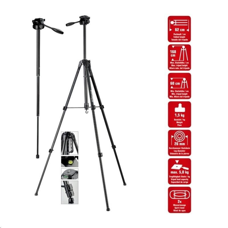 Lehký hliníkový foto/video stativ, 3-směrná hlava s výměnnou destičkou, 2x vodováha, 3 segmenty noh se svorkami, profil 26mm, zatížení maximálně 5kg, rozměry: složený 62cm / výška 60-168cm, hmotnost 1500g, barva černá, včetně pouzdra. Středový sloupek se vzpěrami pro vyšší stabilitu, nastavení výšky s aretací šroubem a možnost vyjmutí plnohodnotného monopodu s hlavou (5 sekcí s výškou 190cm, Click fixace), háček na pověšení příslušenství nebo závaží, plastové ucho pro transport, nohy zakončené gumou..