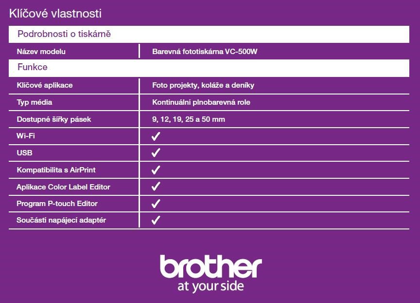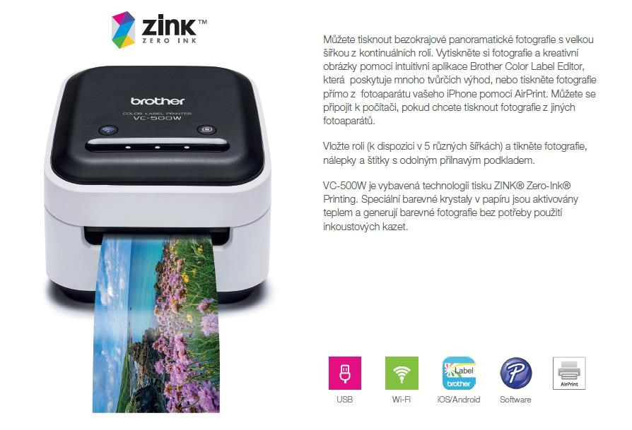 https://www.brother.cz/labelling-machines/vc-500w Barevná fototiskárna VC-500W - ZINK Zero-Ink Full Colour Printing Technology Můžete tisknout bezokrajové panoramatické fotografie s velkou šířkou z kontinuálních rolí. Vytiskněte si fotografie a kreativní obrázky pomocí intuitivní aplikace Brother Color Label Editor, která poskytuje mnoho tvůrčích výhod, nebo tiskněte fotografie přímo z fotoaparátu vašeho iPhone pomocí AirPrint. Můžete se připojit k počítači, pokud chcete tisknout fotografie z jiných fotoaparátů. Vložte roli (k dispozici v 5 různých šířkách) a tikněte fotografie, nálepky a štítky s odolným přilnavým podkladem. VC-500W je vybavená technologií tisku ZINK® Zero-Ink® Printing. Speciální barevné krystaly v papíru jsou aktivovány teplem a generují barevné fotografie bez potřeby použití inkoustových kazet.
