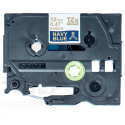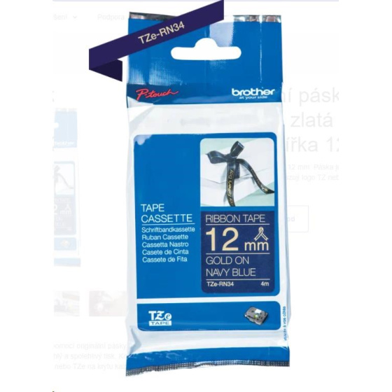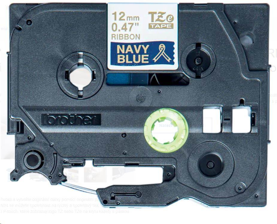 BROTHER TZE-RN34 - kazeta TZ šířky 12mm, TEXTILNÍ páska 4m- pro tvorbu dárků - NELEPÍCÍ - MODRÁ PÁSKA, ZLATÝ POTISK gold