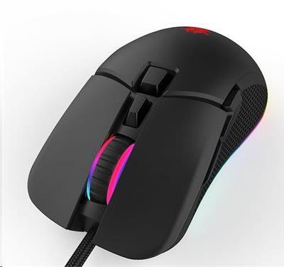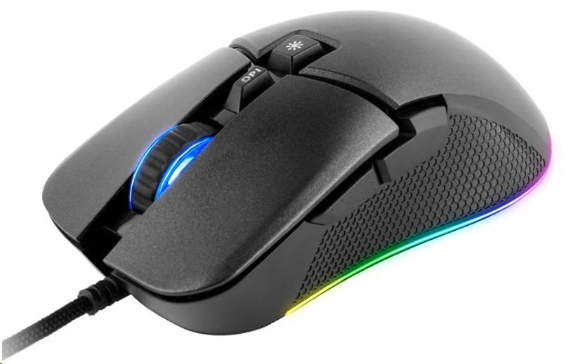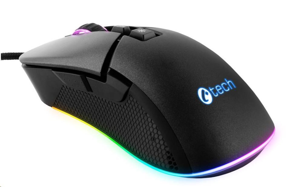 Akční nabídky na váš e-mailHerní myš C-TECH Dawn Vás na první pohled okouzlí svým elegantním tvarem a RGB podsvětlením. Myš disponuje optickým snímačem Sunplus 199 s maximálním rozlišením 6400DPI, které je možno pomocí tlačítka DPI měnit v 5 úrovních. Myš je vybavena 5 tlačítky, které vám poskytnou dokonalou kontrolu nad hrou. Další dvě tlačítka jsou pro změnu DPI a volbu RGB režimu podsvětlení. 5 RGB módy s 16.8 miliony barev oživí váš stůl nejen při hraní her, ale i při kancelářské práci. Myš C-tech Dawn je díky své ergonomii vhodná pro praváky a k počítači ji připojíte 1,5m opleteným kabelem s USB konektorem.