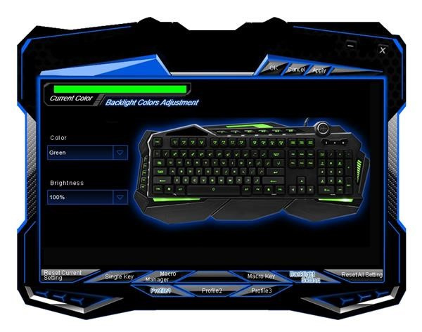 3 profily - na klávesnici naleznete klávesy pro přepínání mezi 3 nezávislými profily. Pro každý profil lze individuelně nastavit barva podsvícení, její intenzita, makra, předefinované klávesy...