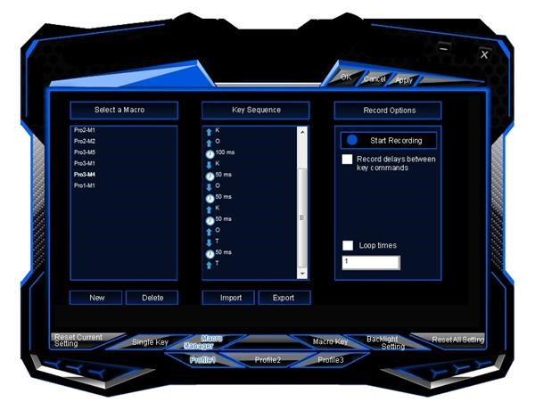 Live macro recording - pomocí této funkce lze nahrávat makra přímo z klávesnice a rovnou je i přidělovat konkrétní klávese