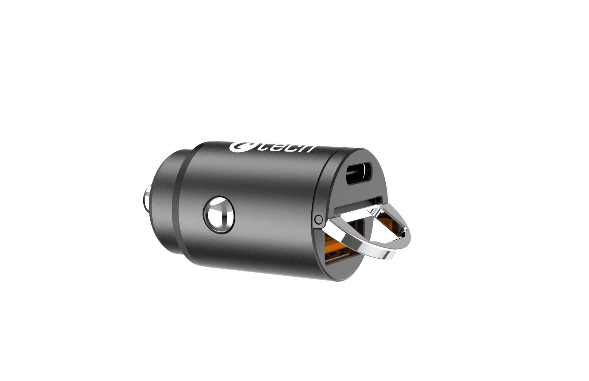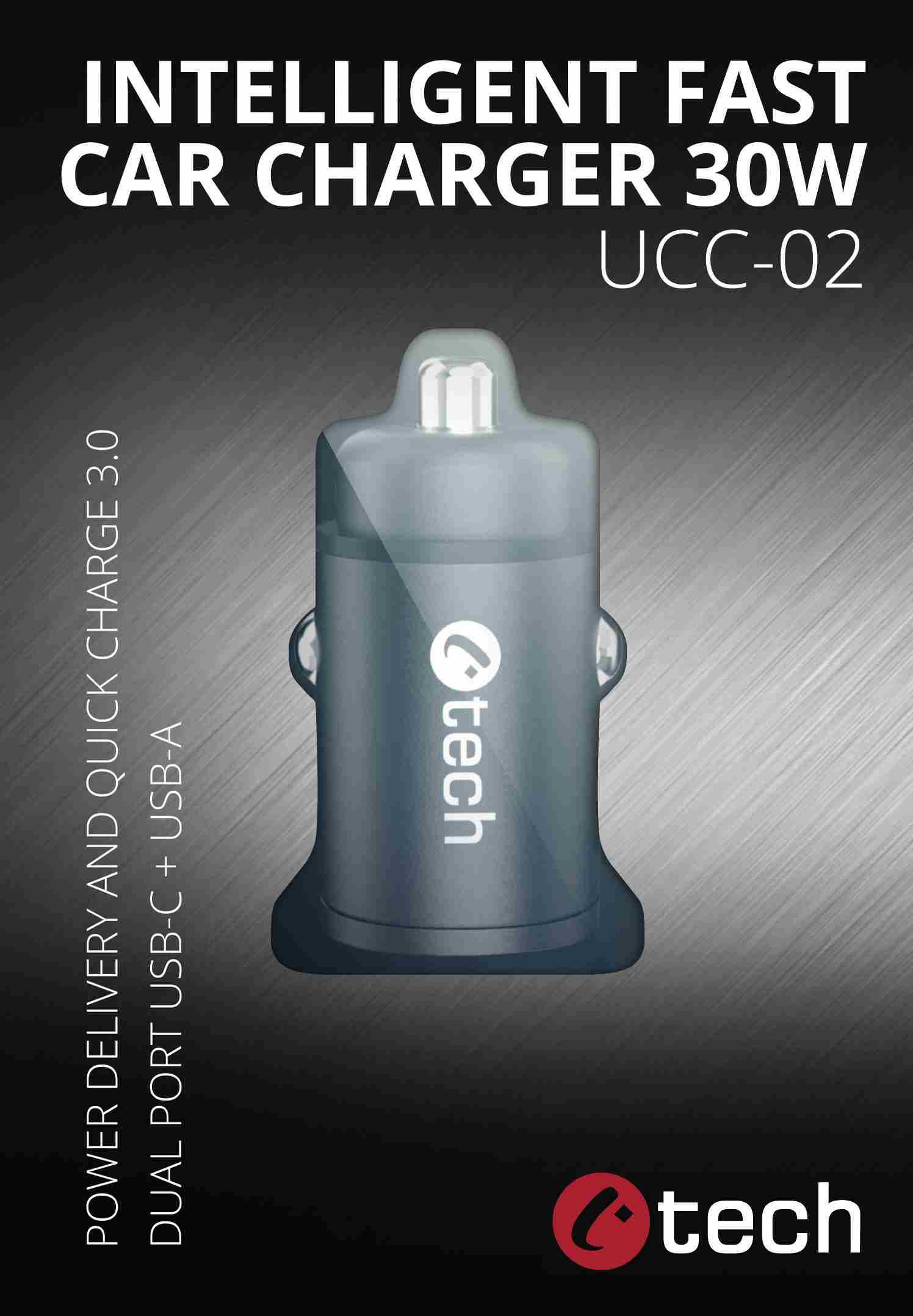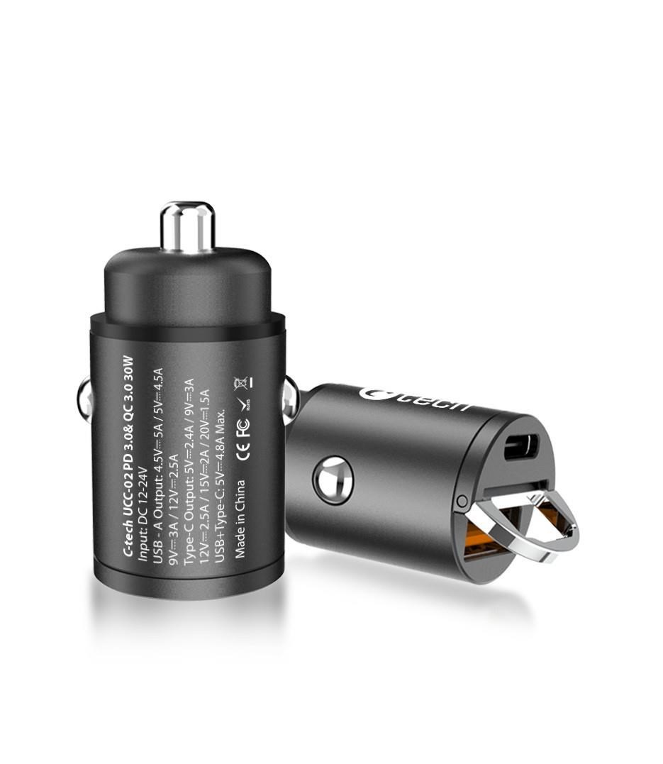 Miniaturní nabíječka do auta C-tech UCC-02 s podporou mnoha technologií rychlého nabíjení se postará o svižné nabití tabletu nebo telefonu. Nabízí vám celkem 2 výstupy typu USB-A a USB-C s celkovým výkonem 30W. Tato malá nabíječka podporuje moderní technologie rychlého dobíjení Power Delivery 3.0, Quick Charge (QC 3.0 + QC 2.0) a řadu dalších standartů rychlého dobíjení. Nabíječku lze použít v osobních a dodávkových vozech s napětím 12 V, ale i u velkých nákladních automobilech s 24V zásuvkou. Inteligentní čip dokáže rozpoznat nabíjené zařízení a přizpůsobit tak potřebné napětí, tímto způsobem šetří energii a zároveň chrání baterii. Nabíječka C-tech UCC-02 je vybavena vybavena 5-ti násobnou ochranou a ochrání tak vaše digitální přístroje před přepětím, podpětím, přetížení sítě, zkratům i vysokým teplotám. Tělo nabíječky je vyrobeno z hliníku a opatřeno stylovou černou povrchovou úpravou - dokonale tak splyne s většinou interiérů. Miniaturní rozměry 73mm x 33mm a nízká váha, činí nabíječku snadno přenosnou, můžete ji mít stále u sebe a využívat její kvality prakticky v každém automobilu. Skládaný úchyt na vrchní straně nabíječky usnadňuje její vytahování ze zásuvky.