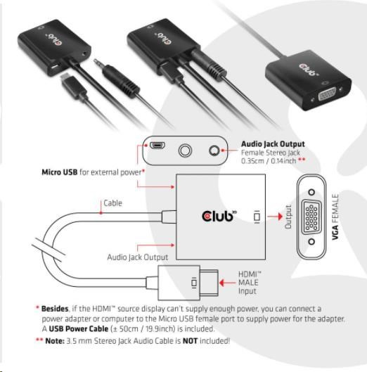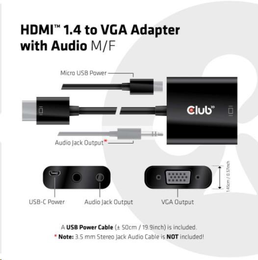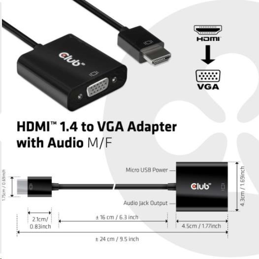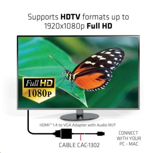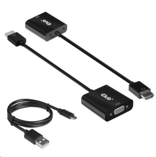 Akční nabídky na váš e-mailThe Club 3D CAC-1302 is an active HDMI™ 1.4 to VGA signal converter. It allows you to convert digital HDMI™ signal into analog VGA signal and extracts audio signal from HDMI™ signal through the R/L audio port.