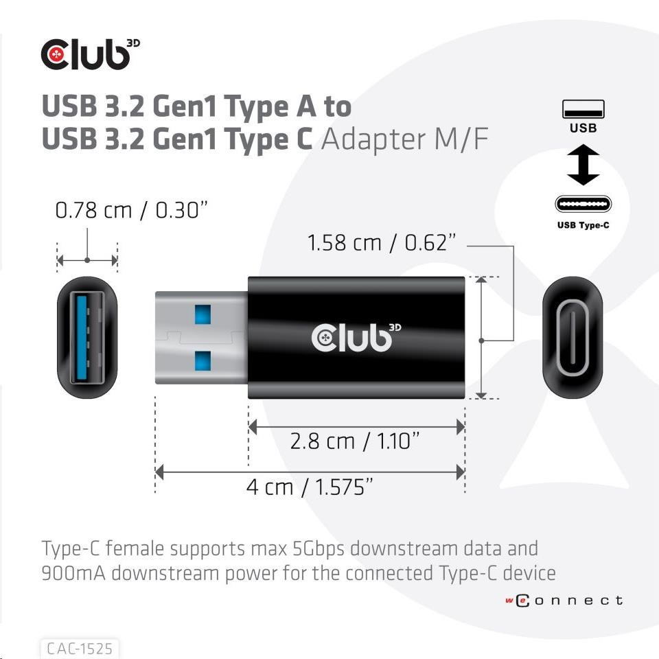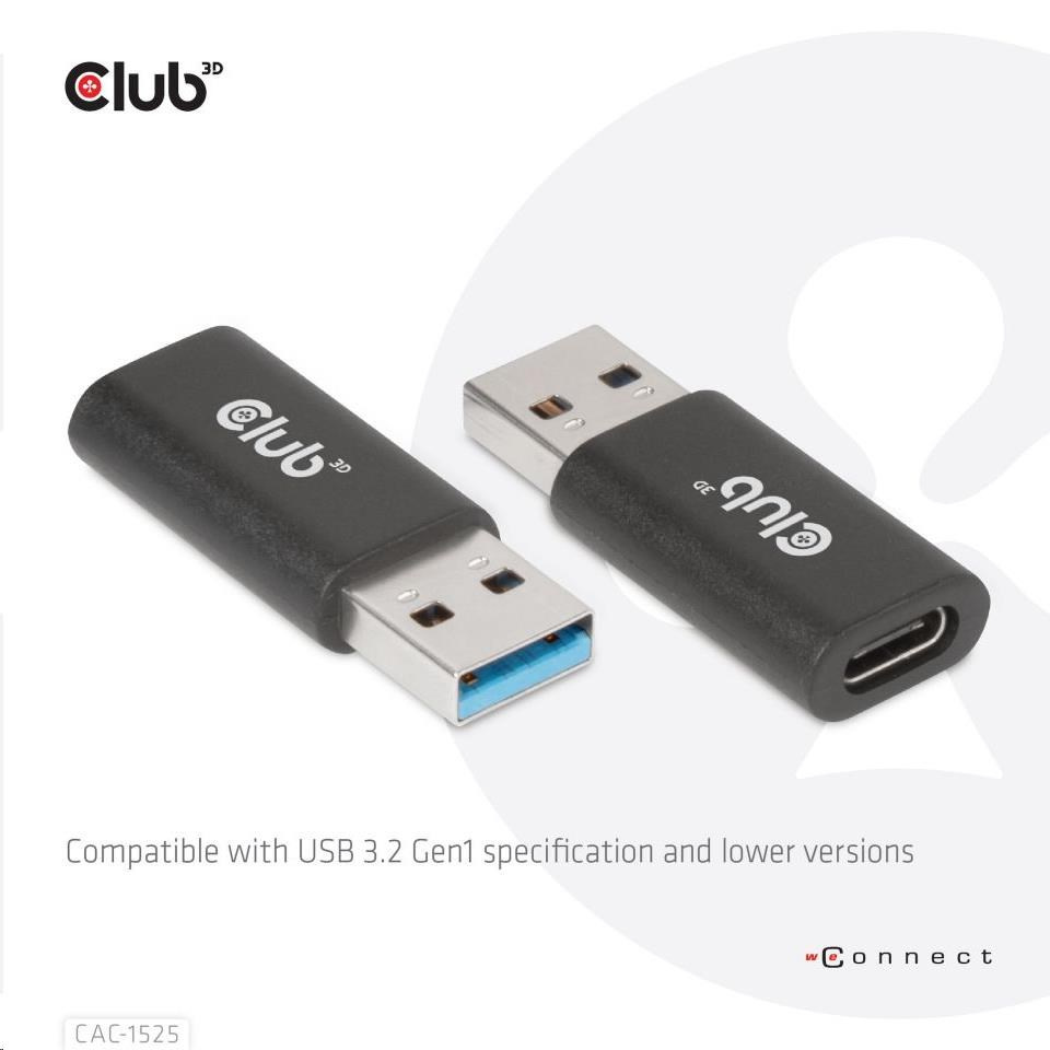 Akční nabídky na váš e-mailCAC-1525 The Club 3D USB 3.2 Gen1 Type A to USB 3.2 Gen1 Type C Adapter which allows you to connect your host PC with USB-A port to devices (such as USB disk, mobile phone) with Type-C port for downstream data and power. Besides, you can also connect a Type-C to USB hub to your USB-A host PC through this product for downstream data and power transmission.