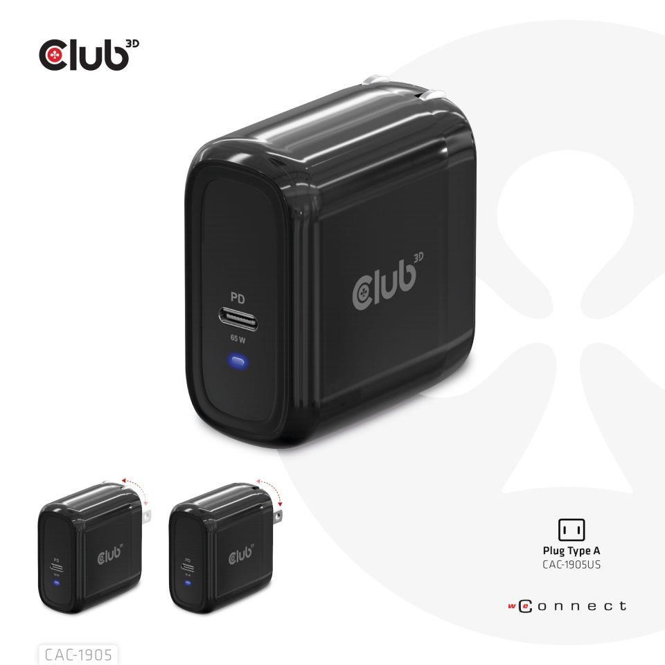 Akční nabídky na váš e-mailThe Club3D CAC-1905 Travel Charger PPS 65W GAN technology, Single port USB Type-C, Power Delivery(PD) 3.0 Support. Compact size & Superior Performance: GAN technology chipset makes this charger 50% smaller than a 65W MacBook chager, small enough to carry anywhere.The Programmable Power Supply(PPS) 65W wall charger match a variety of PD devices from smart phones to laptops, one for all making charging simple. This wide compatibility charger will be your convenient companion during your business trip or vacation.