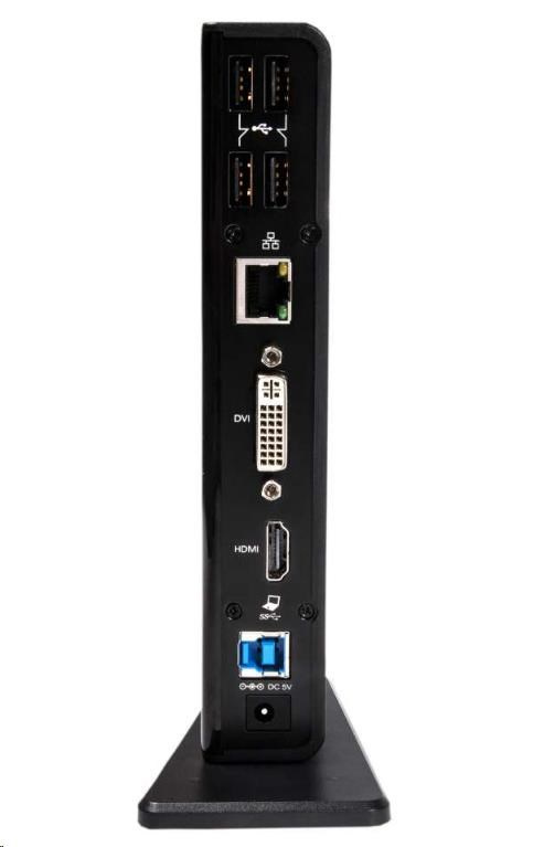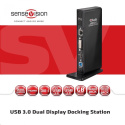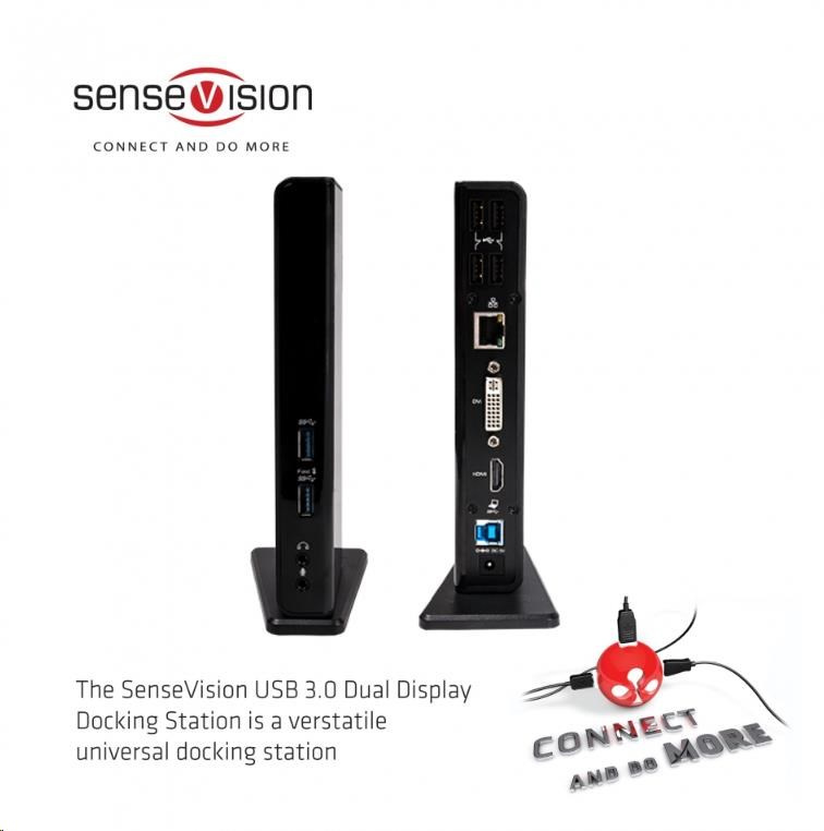 Dokovací stanice SenseVision USB 3.0 Dual Display je dokonalé univerzální zařízení, které vám umožní rozšířit výstupy vašeho notebooku nebo ultrabooku, takže jej můžete používat jako tradiční stolní počítač. Díky čipu DisplayLink ™ DL-3900 je možné k dokovací stanici připojit dva externí monitory s vysokým rozlišením prostřednictvím výstupů HDMI ™ a DVI-I. Má ethernetový port RJ 45 pro spolehlivé a rychlé drátové připojení k síti a nabízí celkem 6 portů USB pro periferie a paměťové zařízení, stejně jako výstup zvuku a mikrofonu. To vše je připojeno k vašemu zařízení pomocí jediného kabelu USB.