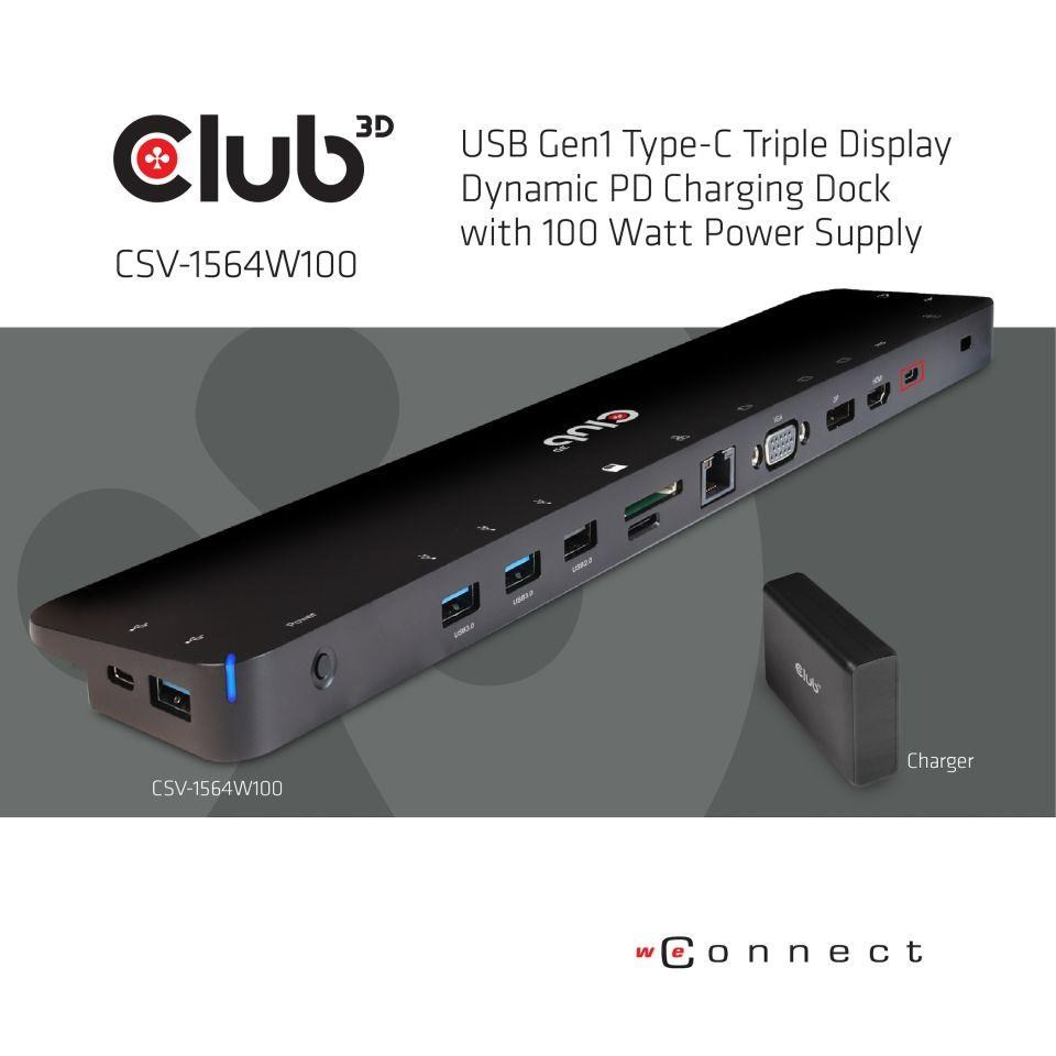 Akční nabídky na váš e-mailCSV-1564W100 - The Club-3D USB 3.2 Gen1 C Triple Display Dynamic PD Charging Dock is an integrated solution combining Video, Data, Power, Ethernet and Audio especially for frequent travellers. The Three different Video ports(HDMI™, DisplayPort™, VGA) allow you to enjoy 3 different images or videos on 3 different displays simultaneously under MST mode. The USB Type A ports and USB Type C data port allow you to connect multiple USB devices to the host. The USB Type C charging port allows you to provide power for this Dock and can charge the host PC at the same time by connecting a PD power Adapter, no need to carry your Notebooks Power Supply.