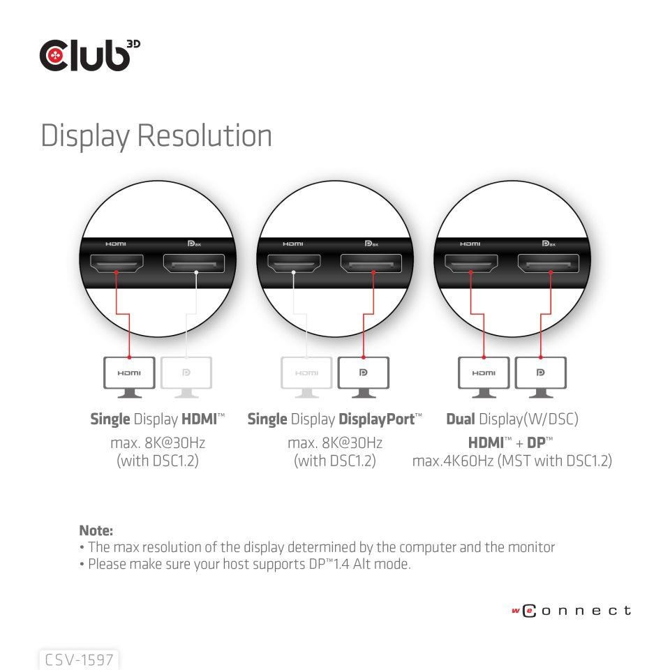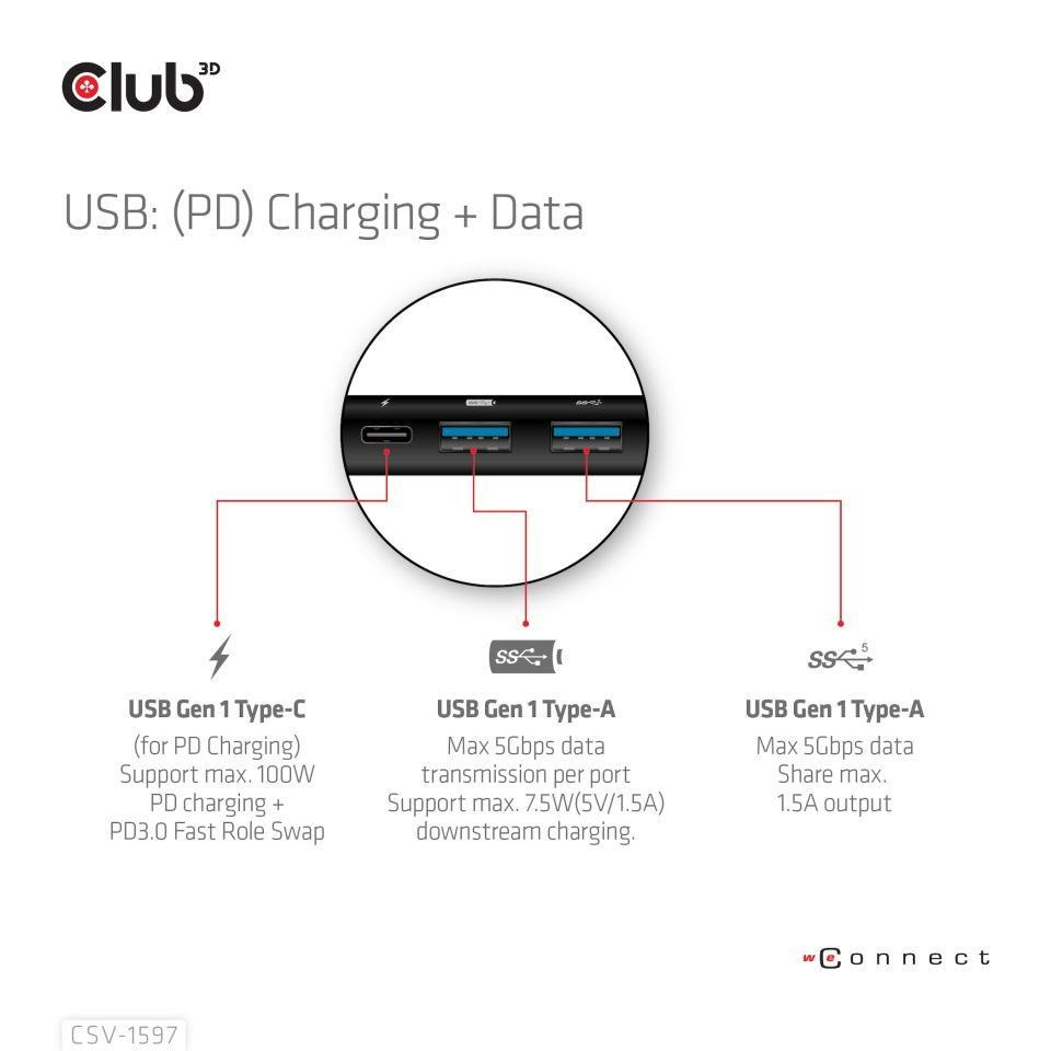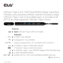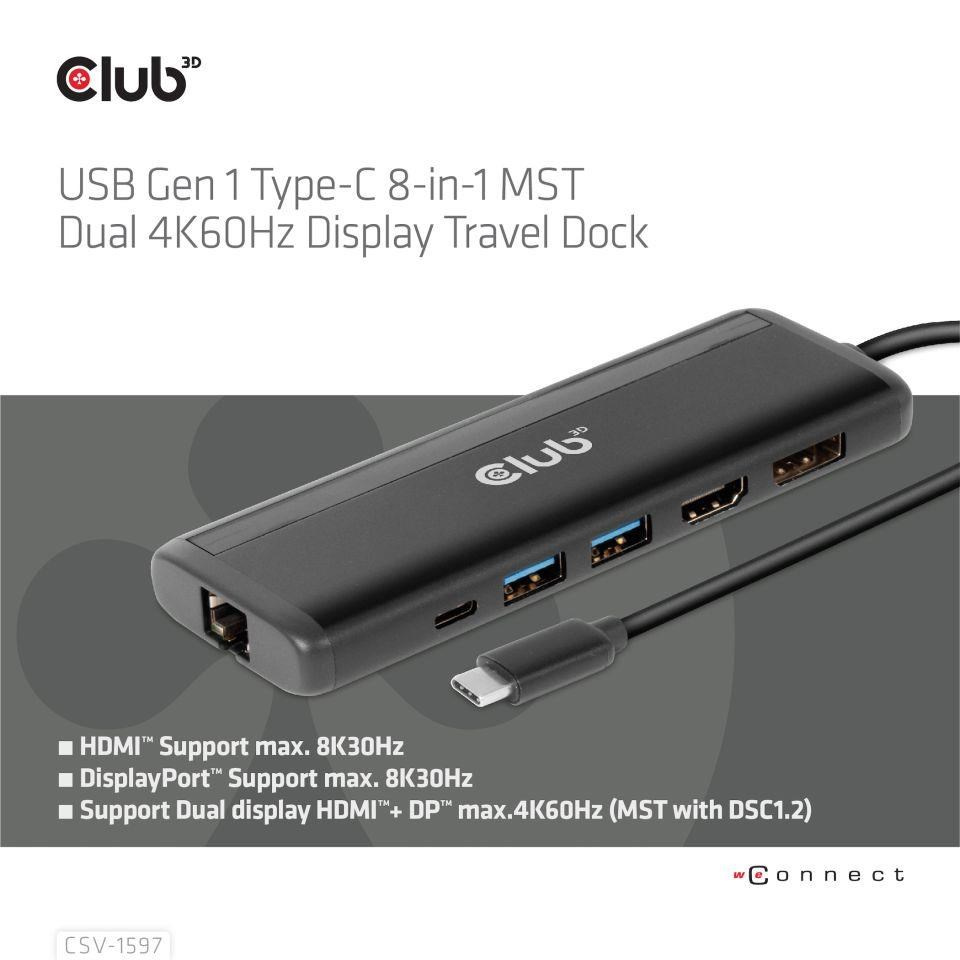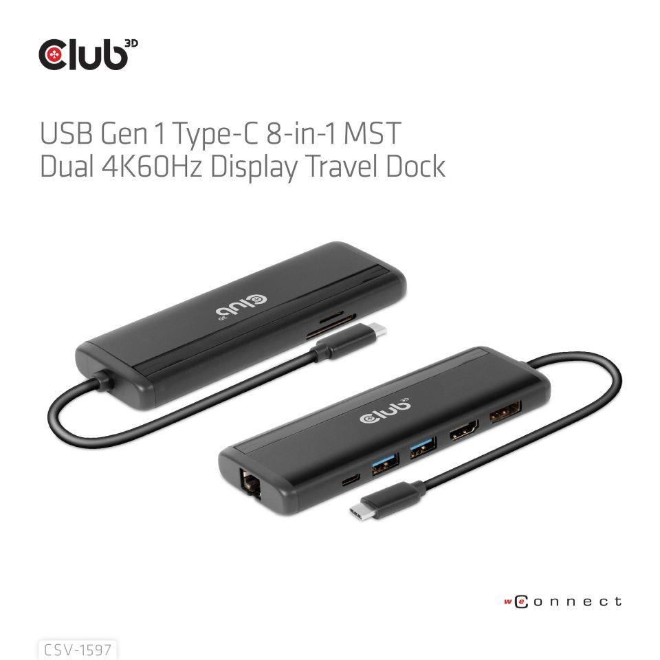 Akční nabídky na váš e-mailThe Club 3D CSV-1597 USB Gen 1 Type-C 8-in-1 MST Dual 4K60Hz Display Travel Dock with HDMI™ 8K30Hz(HDR), DisplayPort™ 8K30Hz, 2x USB Gen 1 Type-A, BC1.2, RJ45, SD/Micro SD card slots and USB Gen 1 Type-C PD3.0 Female port, provides a very advanced, efficient solution to extend a single USB Gen 1 Type-C port to be multiple ports. It integrates video, data and power ports that allows to connect 2 displays simultaneously for enjoying videos on a larger screen, connect multiple USB Gen 1 devices for data transmission up to 5Gbps, connect a Gigabit Ethernet source for getting your PC connected to super high speed network, or connect to headset to enjoy fantastic music. It also provides PD charging for support up to max. 100W PD charging. This is for operating this device and charge the host simultaneously. It can work on all DP™1.4 Alt mode supported USB Gen 1 Type-C hosts.