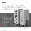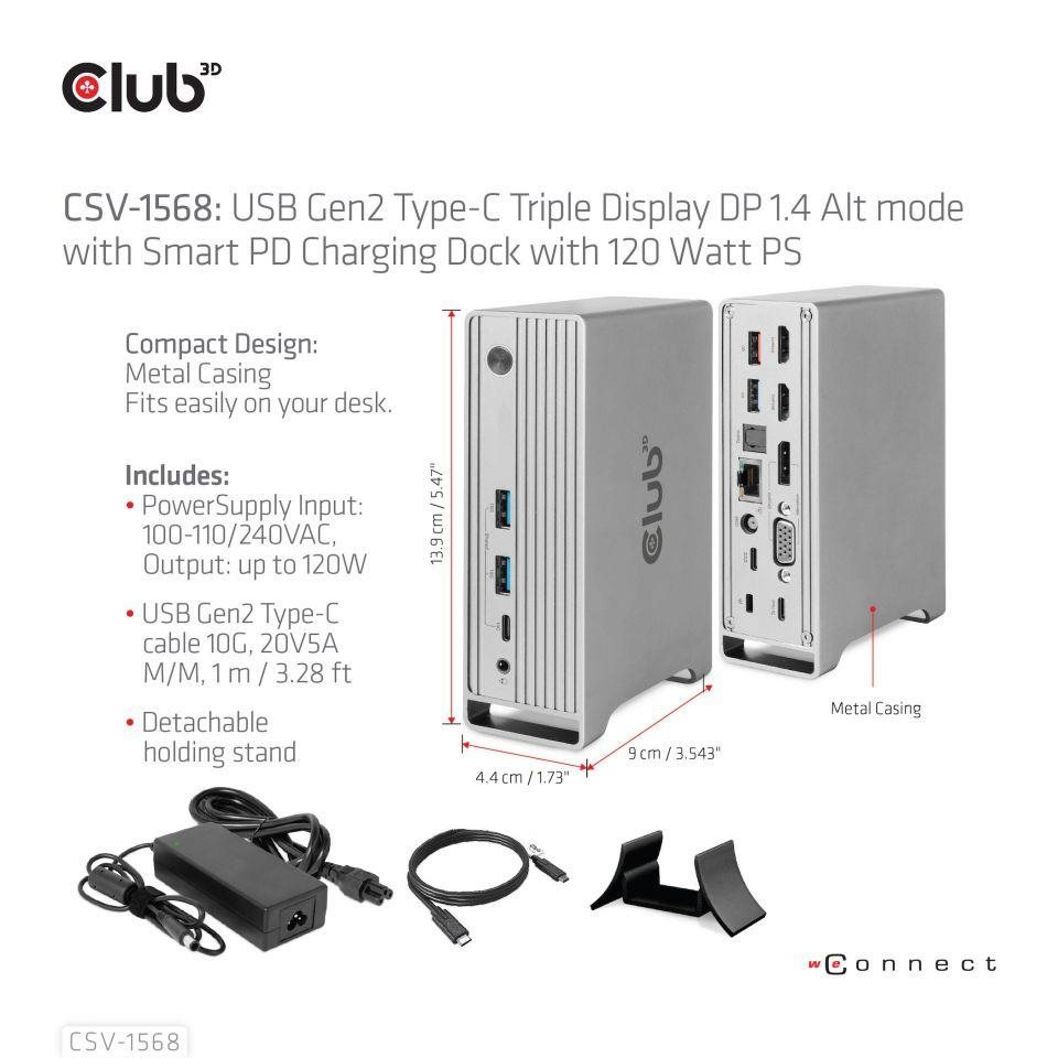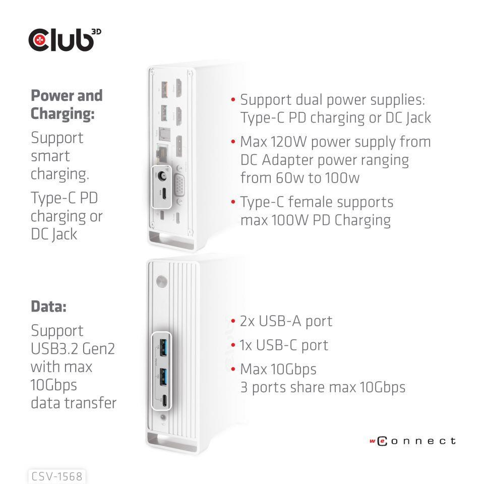 Akční nabídky na váš e-mailThe Club 3D CSV-1568 USB Gen2 Type-C Triple Display DP™ Alt mode + Smart PD Charging Dock with 120 Watt PSU, is an integrated solution combining Video, Data, Power, Ethernet and Audio. It has 4 videos (output 3 videos simultaneously under MST mode) for video transmission, 4 USB data ports (2 USB-A 10G, 1 Type-C 10G, 1 USB-A 5G)for data transmission, 1 USB-A smart charging port for quick charging, 1 Gigabit Ethernet for super fast Ethernet, 2 audio ports (3.5mm audio, Toslink) for enjoying music. Besides, this dock is equipped with dual power jack (Type-C PD Charging or 120W DC power supply).