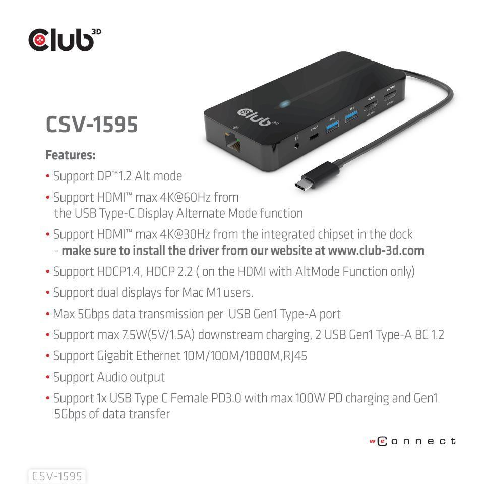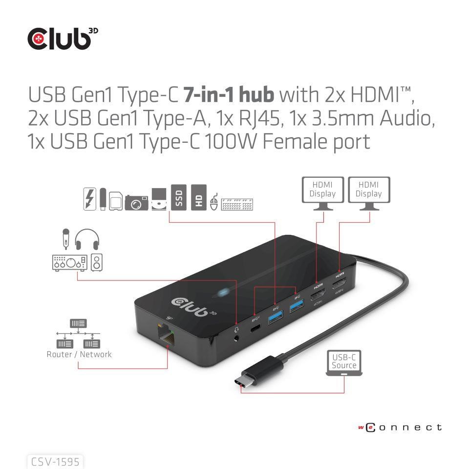 Akční nabídky na váš e-mailThe Club 3D CSV-1595 USB Gen1 Type-C 7-in-1 hub with with 2x HDMI™, 2x USB Gen1 Type-A, 1x RJ45, 1x 3.5mm Audio, 1x USB Gen1 Type-C 100W Female port, provides a very advanced, efficient solution to extend a single USB Gen1 Type-C port to multiple ports. It integrates video, data and power ports that allows to connect 2 displays simultaneously for enjoying videos on a larger screen, connect multiple USB Gen1 devices for data transmission up to 5Gbps, connect a Gigabit Ethernet source for getting your PC connected to super high speed network, or connect to headset to enjoy fantastic music. It also provides PD charging for support up to max. 100W PD charging. This is for operating this device and charge the host simultaneously. It can work on all DP™1.4 Alt mode supported USB Gen1 Type-C hosts.