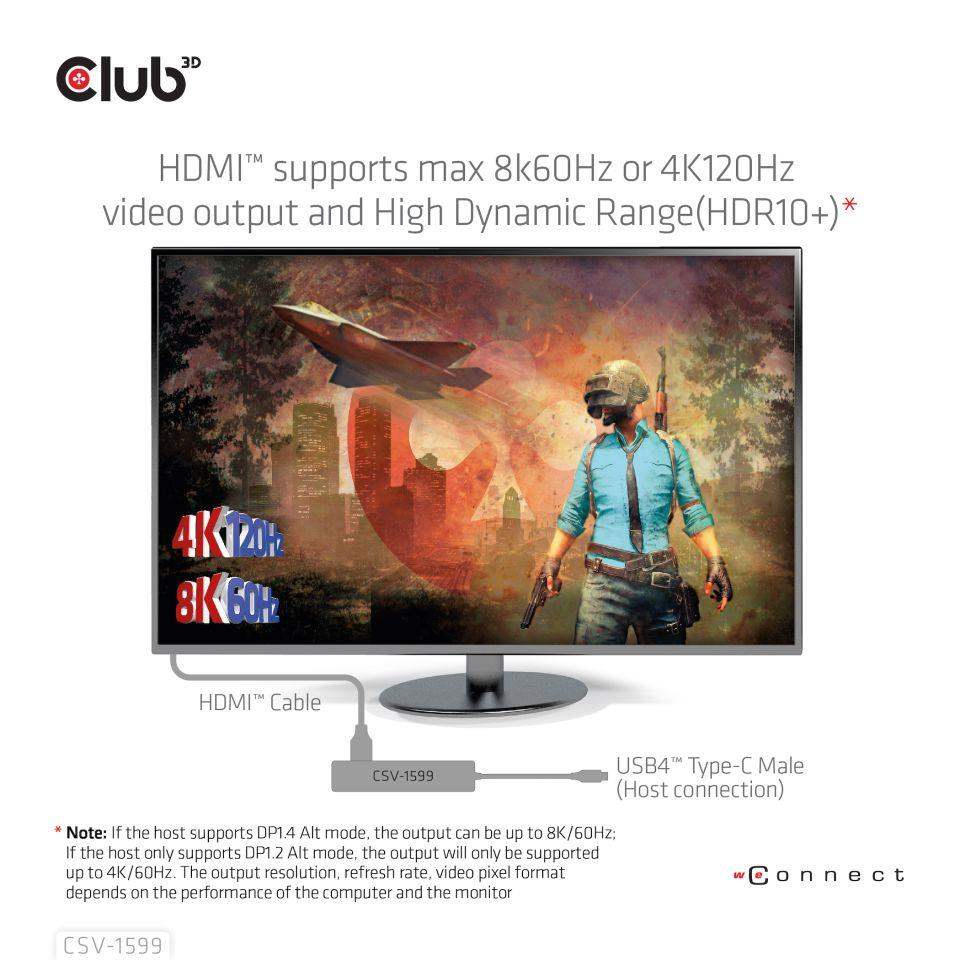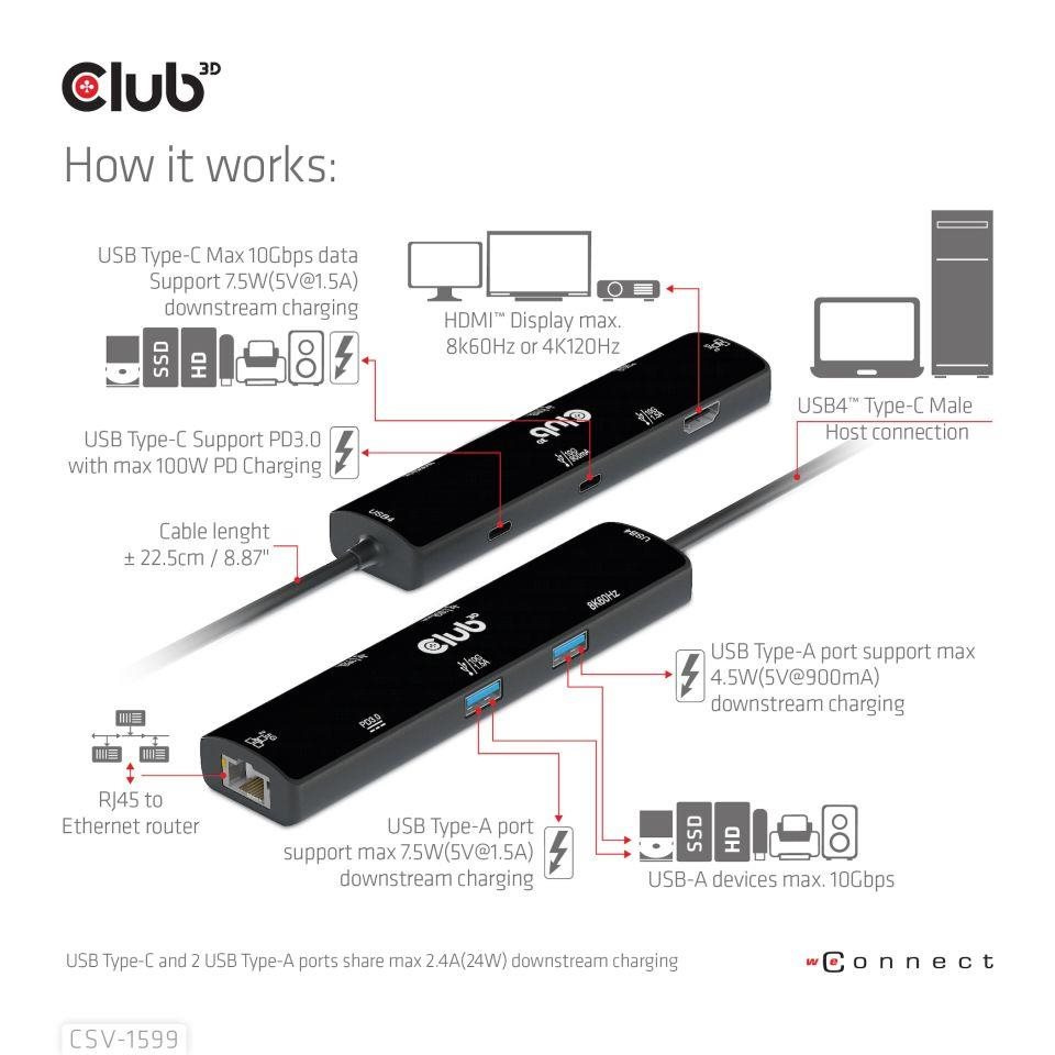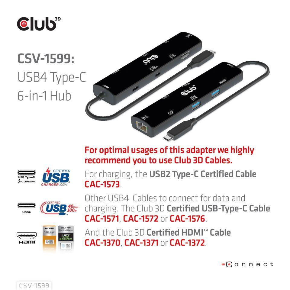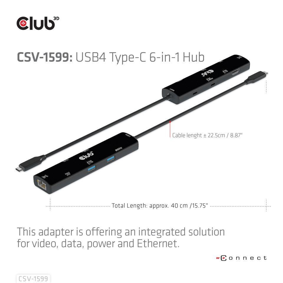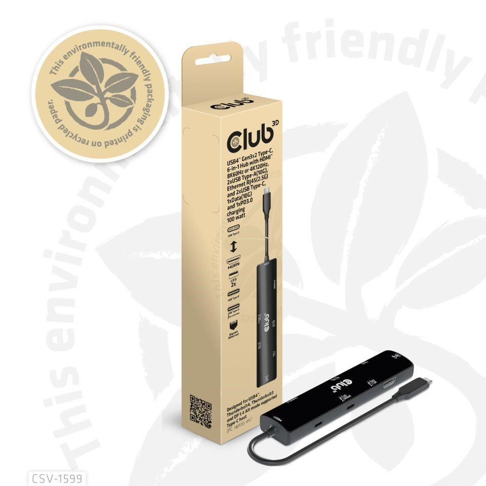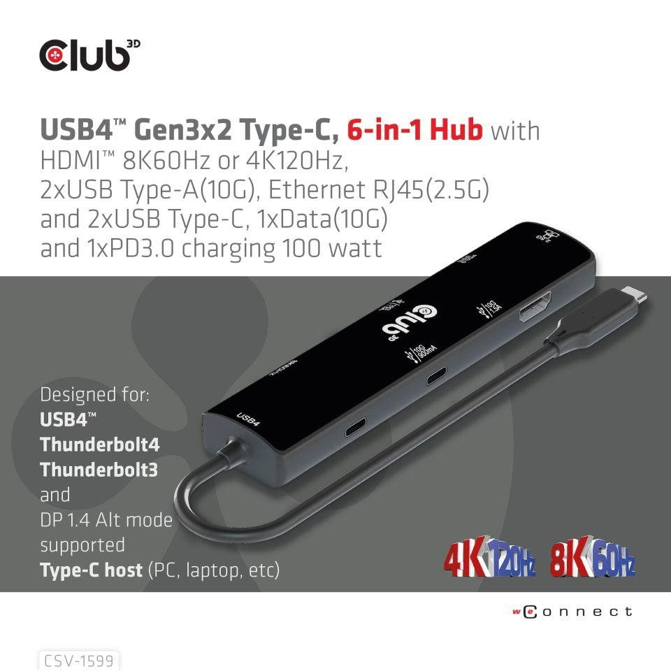 Akční nabídky na váš e-mailThe Club 3D CSV-1599 is a USB4™ Gen3x2 Type-C, 6-in-1 Hub with HDMI™ 8K60Hz or 4K120Hz, 2xUSB Type-A(10G), Ethernet RJ45(2.5G) and 2xUSB Type-C, 1x Data(10G) and 1xPD3.0 charging 100 watt, this adapter is offering an integrated solution for video, data, power and Ethernet. It has a HDMI™(8K60Hz) for video transmission, 3 USB data ports (2 USB-A 10G, 1 Type-C 10G)for data transmission, a 2.5Gbps Ethernet port for surfing on line. Besides, this adapter is equipped with Type-C PD3.0 Charging port with max 100W power supply. It can work on USB4™, Thunderbolt4, Thunderbolt3 and DP Alt mode (15W is dedicated to the functioning of this product, the rest power(max 85W) will be passed to charge for the host. This 6-in-1 Hub will work on all DP Alt mode supported Type-C hosts.
