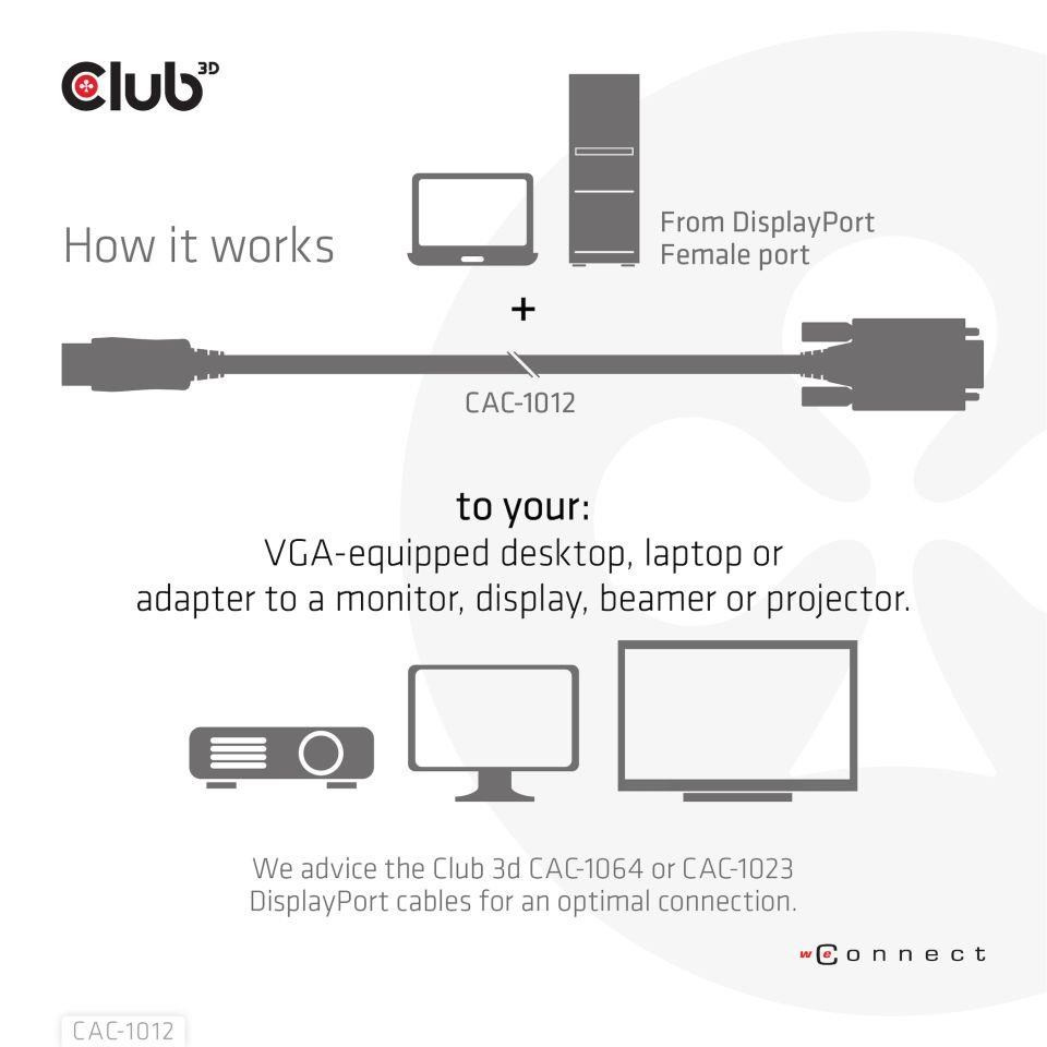 Akční nabídky na váš e-mailThe Club 3D CAC-1012 DisplayPort™ to VGA Cable M/M 2m/6.56ft 28AWG links any DisplayPort™-equipped desktop, laptop or adapter to a monitor, display, beamer or projector with a 15-pin VGA Female port. Ideal for at home or work, the cable creates a reliable connection for anything from gaming to video projection and supports up to Full HD 1080p(max. resolution of 1920 x 1080). A Micro USB port is also provide for External Power. This quality DisplayPort™ to VGA cable provides superior performance thanks to the combined effect of its Gold plated connectors and 28 AWG conductors. Internal shielding provides reduced crosstalk, suppresses noise, and helps prevent electromagnetic interference (EMI) and radio frequency interference (RFI).Experience a reliable, high-quality connection with this convenient DisplayPort™ to VGA 2m/6.56ft cable.