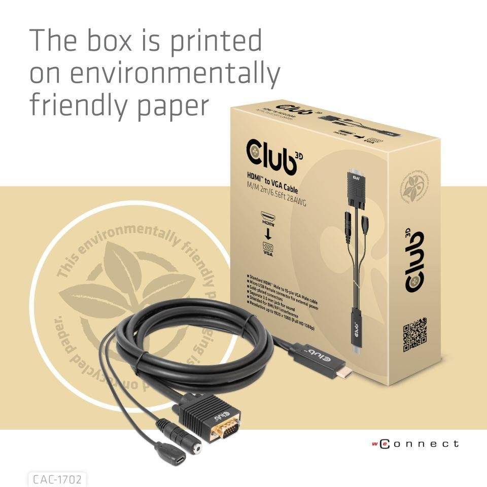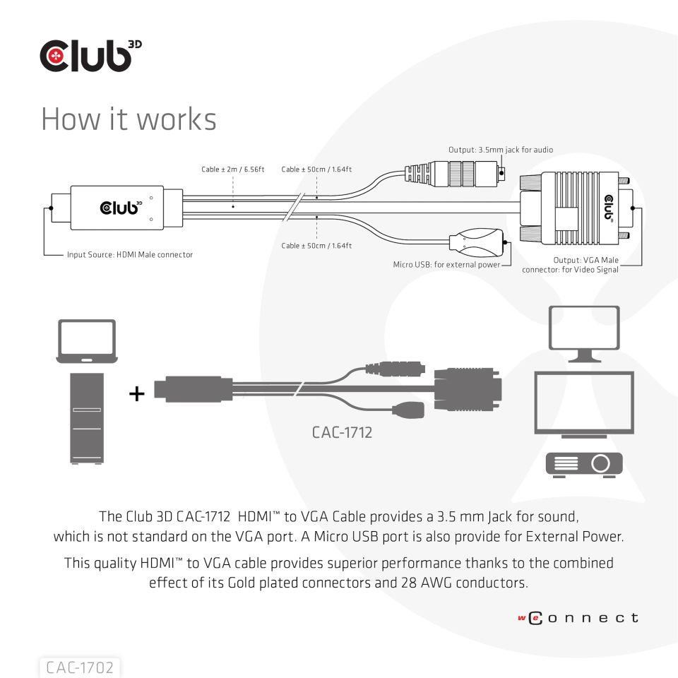 Akční nabídky na váš e-mailThe Club 3D CAC-1712 HDMI™ to VGA Cable M/M 2m/6.56ft 28AWG links any HDMI™-equipped desktop, laptop or adapter to a monitor, display, beamer or projector with a 15-pin VGA Female port. Ideal for at home or work, the cable creates a reliable connection for anything from gaming to video projection and supports up to Full HD 1080p(max. resolution of 1920 x 1080).