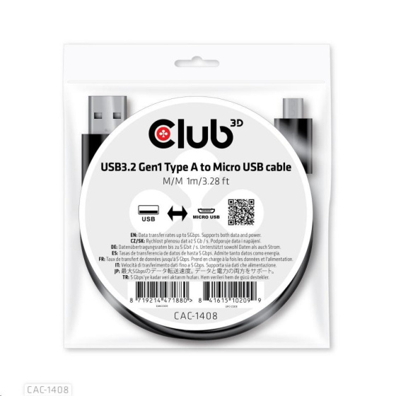 Akční nabídky na váš e-mailCAC-1408 - The Club 3D USB 3.2 Gen1 Type-A to Micro USB Cable enables the connection of your existing USB Type A output connections, Laptops, tablets and Ultrabooks, Power Chargers, etc. to Micro USB inputs, like camera's, Phones and our range of extension cables and adapters.