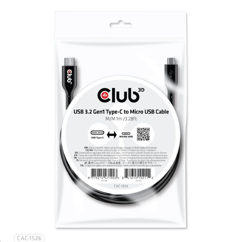 Akční nabídky na váš e-mailThe Club 3D CAC-1526 USB 3.2 Gen1 Type-C to Micro USB Cable enables the connection of your existing USB Type C output connections, Laptops, tablets and Ultrabooks, Power Chargers, etc. to Micro USB inputs, like camera's, Phones and our range of extension cables and adapters.