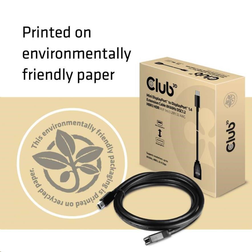 | Club 3D Mini DisplayPort™ to DisplayPort™ 1.4 Extension Cable 8K60Hz DSC1.2 HBR3 HDR M/F 1m/3.28ft 32AWG |