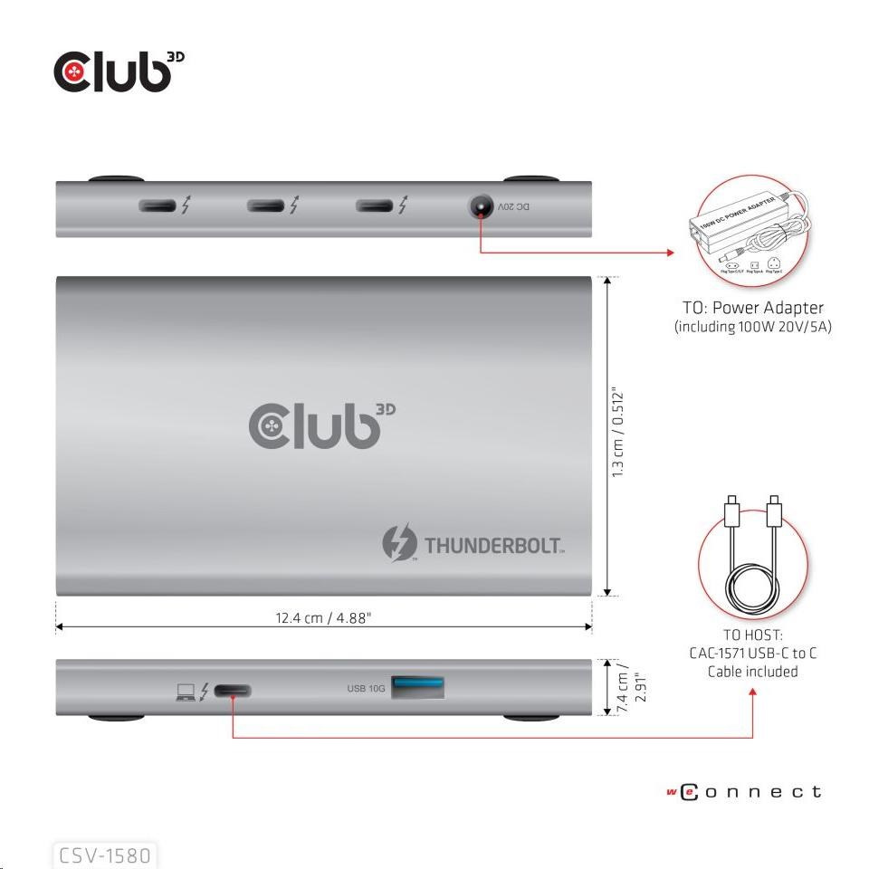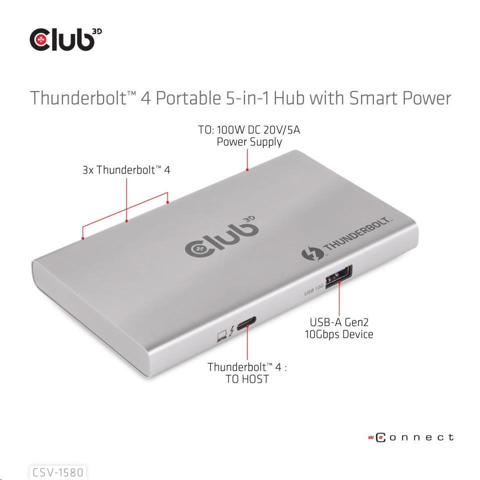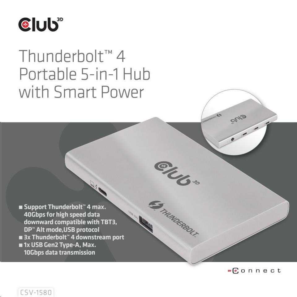 Akční nabídky na váš e-mailThe Club 3D CSV-1580 is a Certified Thunderbolt™ 4 portable Hub which provides the most advanced, efficient, and versatile I/O solution available with up to 40Gb/s for data and video. For the first time this Thunderbolt™ 4 modern Hub has 3 Thunderbolt™ 4 downstream ports that allow you to cascade Thunderbolt™ 4 devices to one 8K30Hz or two 4K60Hz monitors, it can also easily connect to any USB Type-C device, all while simultaneously charging the PC. Besides, it supports Smart Power function which enables to distribute power according to the power consumption of the connected device, making full use of external power supply. It is designed for Thunderbolt™ 4 based PCs and Thunderbolt™ 3 based Macs™ utilizing MacOS™ 11 and later versions.