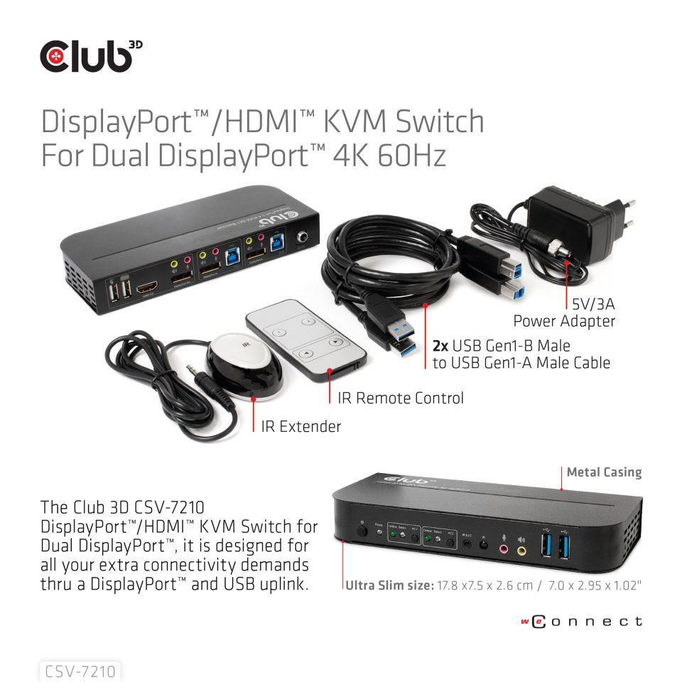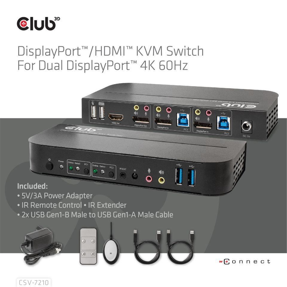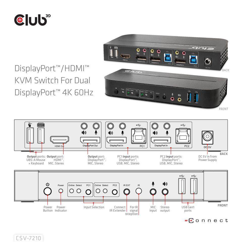 Akční nabídky na váš e-mailThe CSV-7210 is a high performance DisplayPort™ KVM (Keyboard Video and Mouse) switcher. It routes high definition videos up to 4096x2160 at 60Hz resolution and audio from any DisplayPort™ source to any HDMI™ or DisplayPort™ supported display. This DisplayPort™ KVM switcher not only has the key press switching function, but also has an intelligent function as well as hot pluggable function.