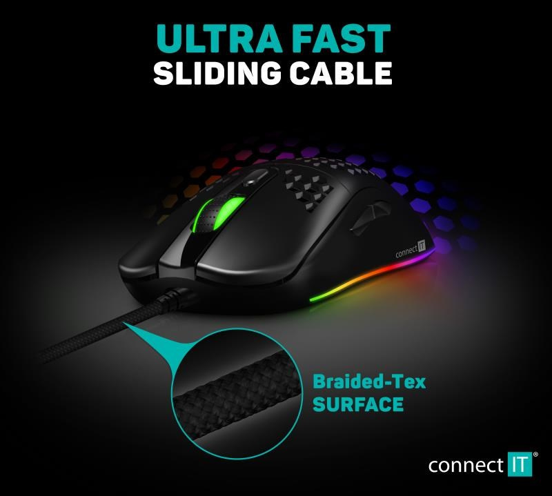 Kromě běžných funkcí je tato myš unikátní svojí odlehčenou konstrukcí. Díky perforaci těla myši a tlačítek speciálním hexagonovým tvarem, kterým došlo ke snížení váhy myši o 50%. Tento typ perforace zajistí maximální grip a stabilitu při dlouhodobém hraní. K této myši je dodáván software ke stažení zcela zdarma na stránkách www.connectit-europe.com. Samozřejmostí je u této série prémiový oplet přívodního kabelu a pozlacený USB konektor.