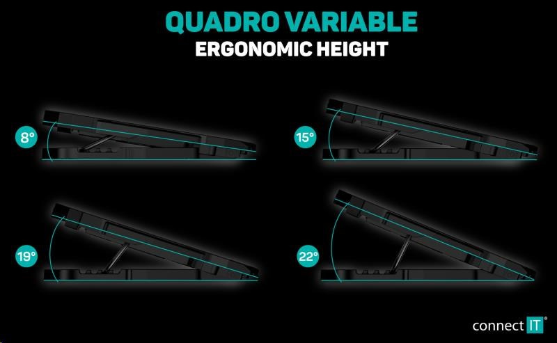 Podložka zajišťuje jak odvod tepla z notebooku a jeho ventilačních otvorů, tak i přímé ochlazování pláště notebooku díky cirkulaci chladného vzduchu a celkově tak zvyšuje výkon notebooku. Je plně kompatibilní s notebooky až do velikosti 15,6" a díky kompaktním rozměrům je předurčena jak pro práci doma a v kanceláři, tak i pro cestování a časté přenášení. Ultratichý chod 4 ventilátorů vás nebude rušit ani při nejnáročnější práci vyžadující maximální soustředění. Výšková polohovatelnost ve 4 různých stupních vám zajišťuje maximální pohodlí i při delších pracovních či herních sezeních.
