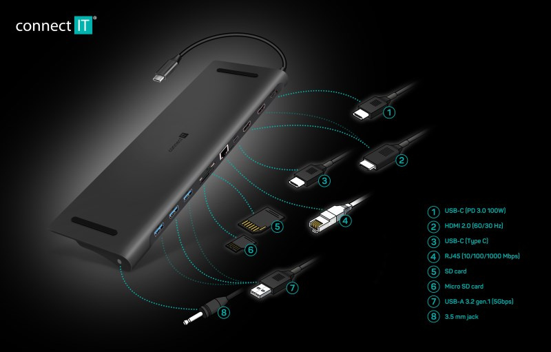 | Výstup | 1x USB-C (podpora 100 W Power Delivery PD 2.0) 1x USB-C (Type C) 2x HDMI 2.0 (4K@60Hz/30Hz) 3x USB-A (3.2 gen. 1 s přenosovou rychlostí 5 Gbps) 1x RJ45 Gigabit Ethernet (10/100/1000 Mbps) 1x 3.5 mm jack 1x SD karta 1x MicroSD karta |