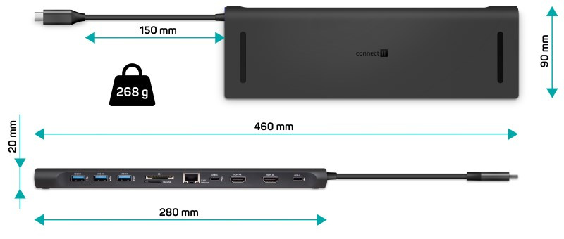 Umožní napájení a připojení dalších periferií jako jsou např. monitor, projektor, televize, myš, klávesnice, MP3 přehrávač, scanner, tiskárna, digitální fotoaparát, externí pevný disk, flashdisk, sluchátka atd. Jedná se o výborný doplněk běžných stolních počítačů i přenosných notebooků, které nemají dostatek vlastních portů. Díky svým kompaktním rozměrům se jedná o ideální příslušenství k notebookům na cesty. Pro připojení k počítači je určeno rozhraní USB-C (Type-C). Hub je možné napájet pomocí USB-C Power Delivery portu. K hubu můžete připojit jakékoli zařízení standardu HDMI, USB-C (Type-C), USB 3.0, 2.0 nebo 1.1 jako jsou myš, klávesnice, MP3 přehrávač, scanner, tiskárna, digitální fotoaparát, externí pevný disk, flashdisk atd.