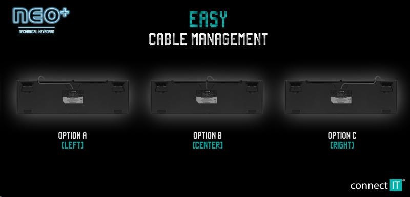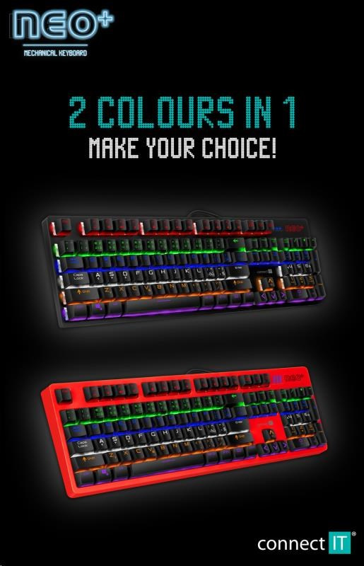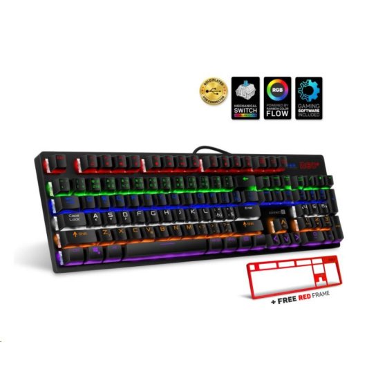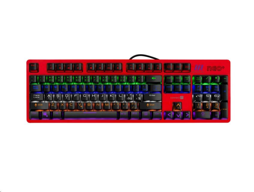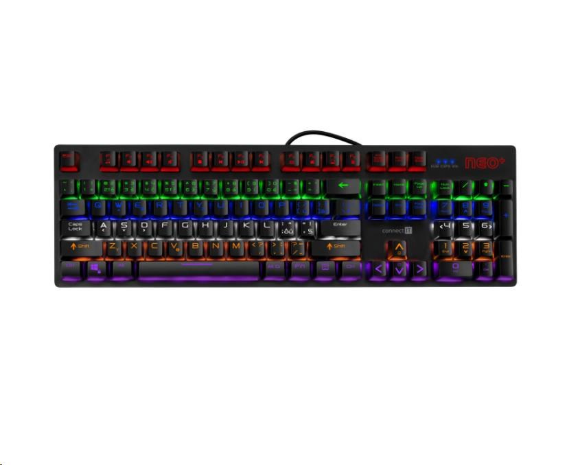 Profesionální mechanická klávesnice NEO+ series pro hráče počítačových her v českém a slovenském layoutu s celkem 22 módy barevného rainbow podsvícení a pětistupňovou regulací intenzity podsvícení. K dispozici je 12 multimediálních kláves.