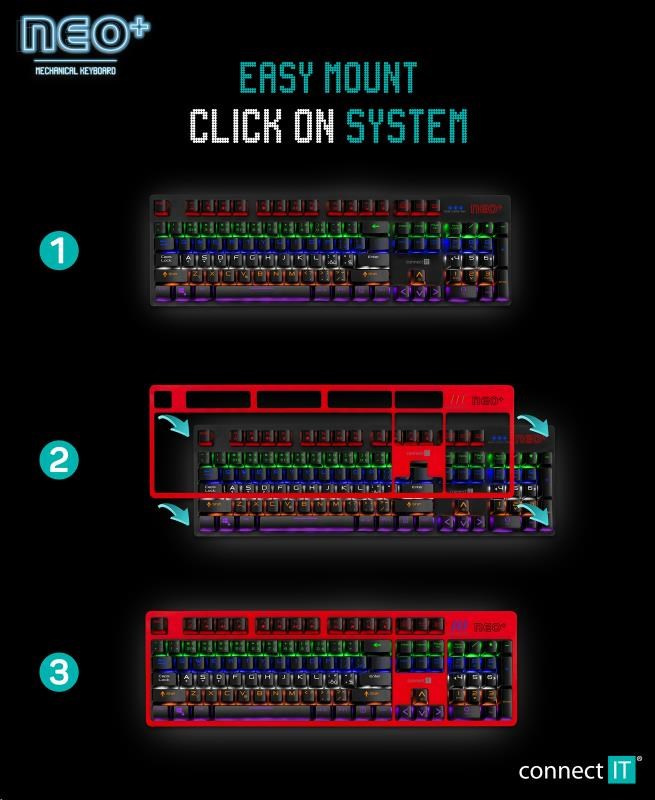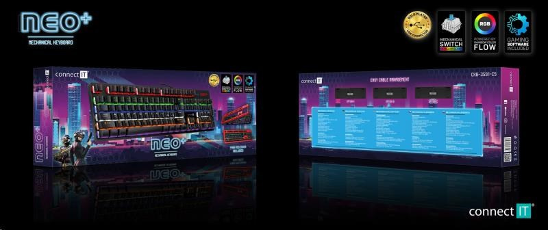 | Obsah balení | - Klávesnice - Vyměnitelný červený rámeček na klávesnici - Arch 7 ks promo samolepek "CONNECT IT NEO" - Návod k obsluze |