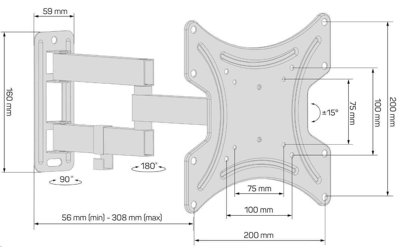 Rozměry držáku při maximální vzdálenosti od stěny (š x v x h): 220 x 220 x 308 mm