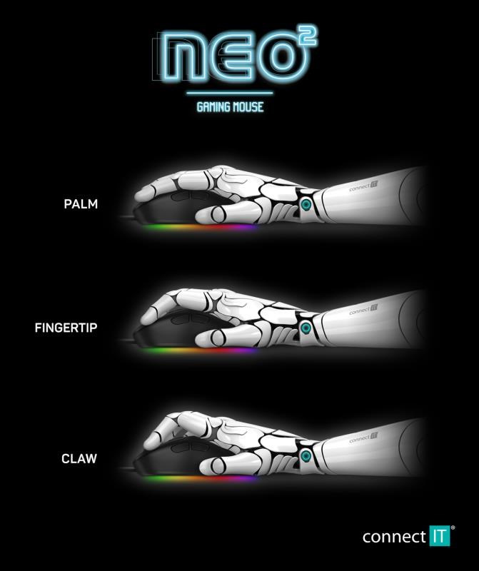 | Standardní (výrobní) nastavení tlačítek | - levé tlačítko = levý klik - pravé tlačítko = pravý klik - kolečko = rolování - vrchní tlačítko = změna DPI - vrchní tlačítko = změna podsvícení - boční přední tlačítko = vpřed - boční zadní tlačítko = vzad |
